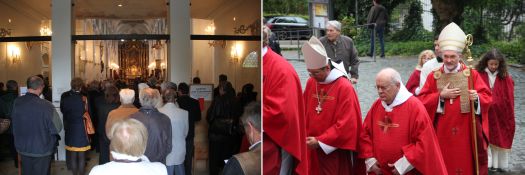 Der Klosterhof war zwar grundsätzlich vorbereitet, um für den Fall trockenen Wetters den Platz für Wallfahrer und Einheimische zu bieten, immer wieder aufkommender Nieselregen veranlasste die Klostergemeinschaft jedoch, für den Festgottesdienst in die Basilika einzuziehen. Hier war der Platz aber eindeutig nicht ausreichend, um allen Gläubigen zu genügen.