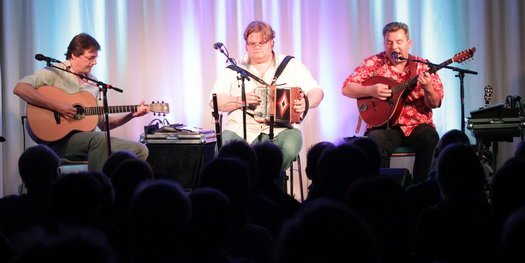 Der Stimmung auf und vor der Bühne tat das aber keinen Abbruch – ganz im Gegenteil schon beim dritten Lied klatschte der ganze Saal im Takt mit. „Das ist Eventmusik“, so der Kommentar von Trasnu. Und so waren schon nach wenigen Minuten nicht nur Guido, Cornelius und Steffen vom bayrischen Publikum, sondern auch das bayrische Publikum von der irischen Musik begeistert. Dabei spielten die Jungs keineswegs irischen Folk im klassischen Sinne. Getreu ihrem Namen Trasnu, der aus dem Gälischen stammt, und übersetzt so viel bedeutet wie „überbrücken und überqueren“, streiften die drei Musiker in ihrem Konzert ausgehend von Irland, auch Schottland, Kanada und Amerika.