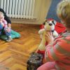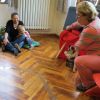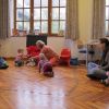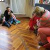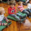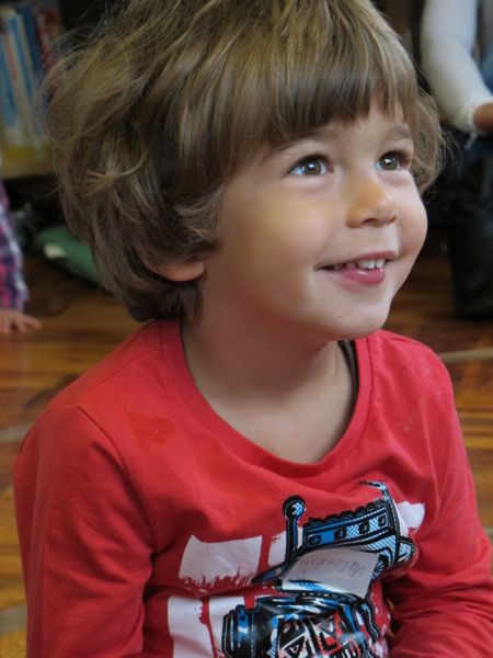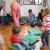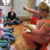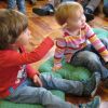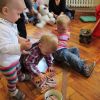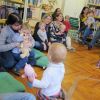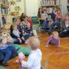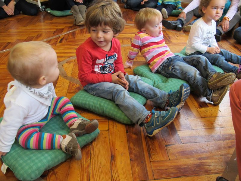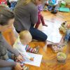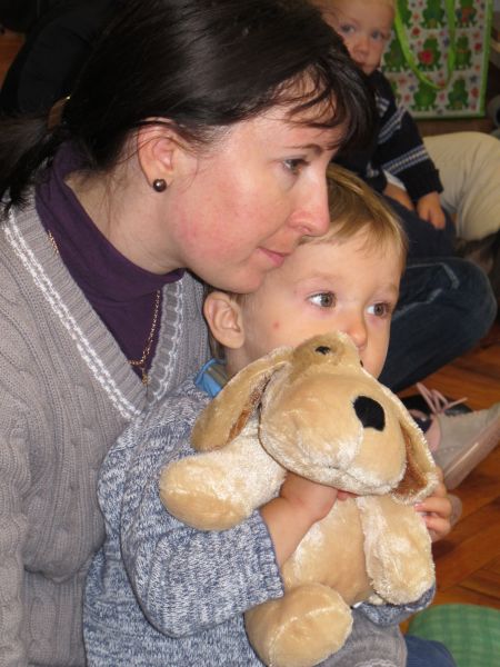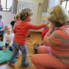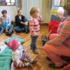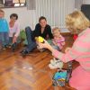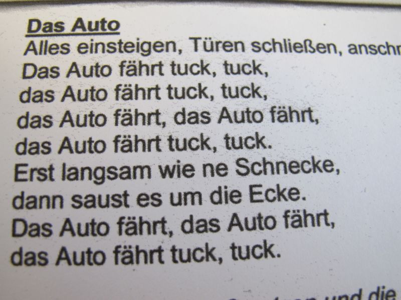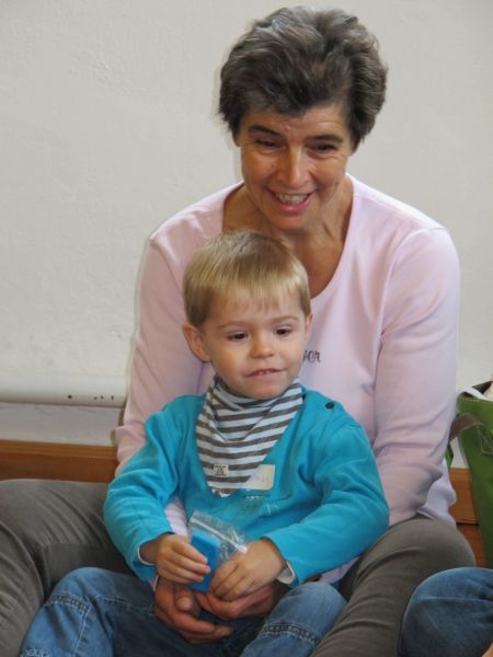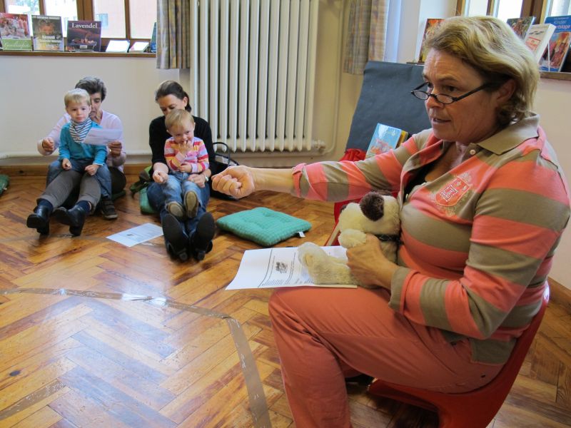Nach der Geschichte, bei der die Kleinen relativ still sein mussten wurden noch einige Mitmachlieder gesungen. Da ging es auch ums Autofahren. Die Mamas, Omas und Frau Fuchs waren die Autos und tuckerten los, ja und die Kinder, die saßen auf dem Schoß und ließen sich durchschütteln.