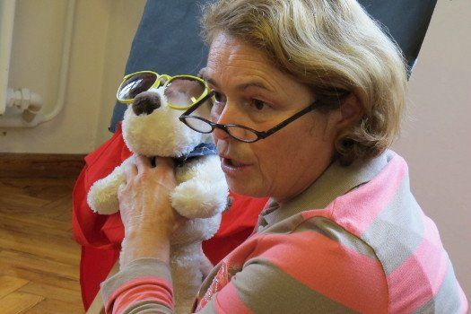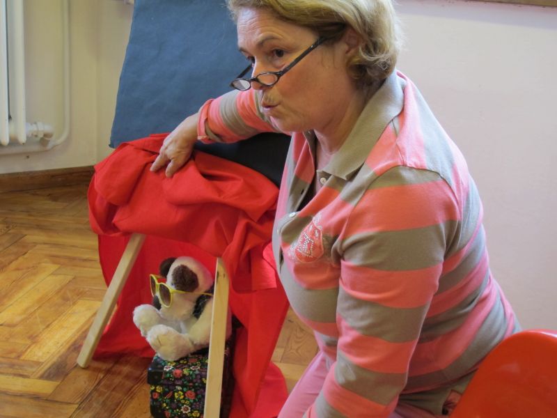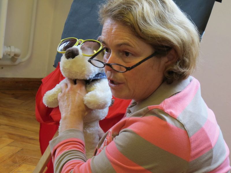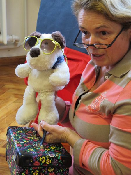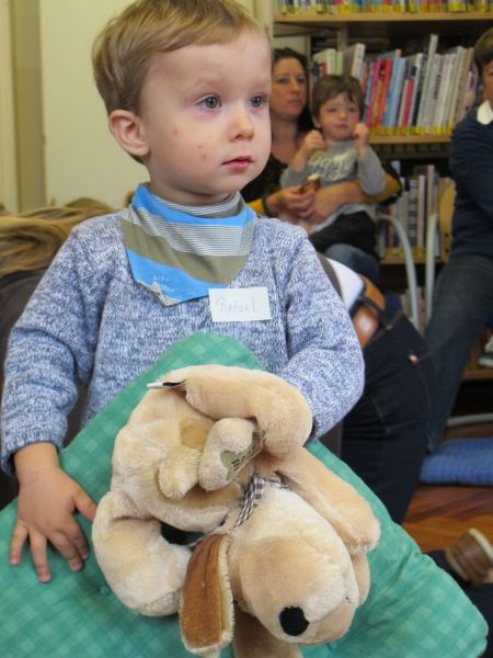 Zu Anfang suchte aber Frau Fuchs erst mal unter den begeisterten Zurufen der Mädchen und Buben „Wuff“, der sich ein gutes Versteck gesucht hatte. Der Stoffhund, der fast jedes Mal mit dabei ist, hatte diesmal noch sein Sommeroutfit an, was bei diesem Wetter doch sehr verwunderlich war.
