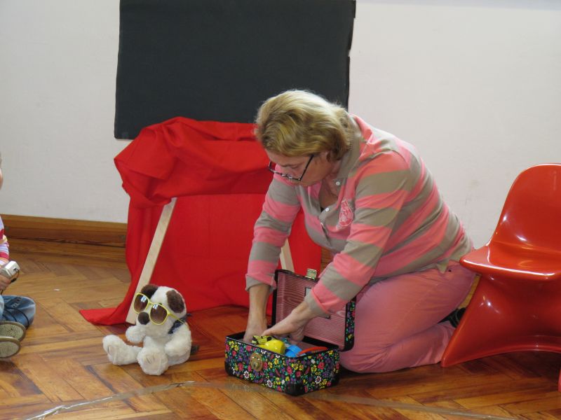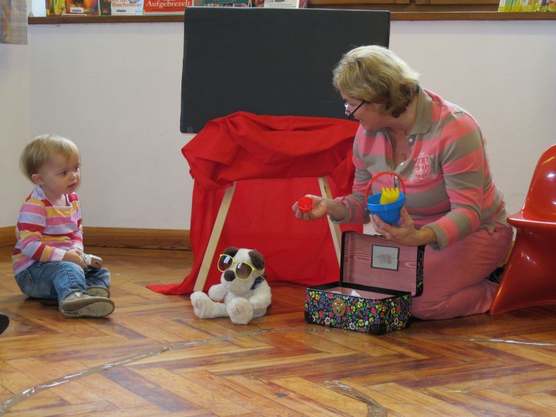 Ein Fotoapparat, eine Badehose, ein Handtuch, eine Gummiente und jede Menge Sandspielzeug kamen zum Vorschein. Sogar die Kleinsten wussten sofort, dass Wuff grade aus dem Urlaub zurückkam und darum ging es auch in der Geschichte.