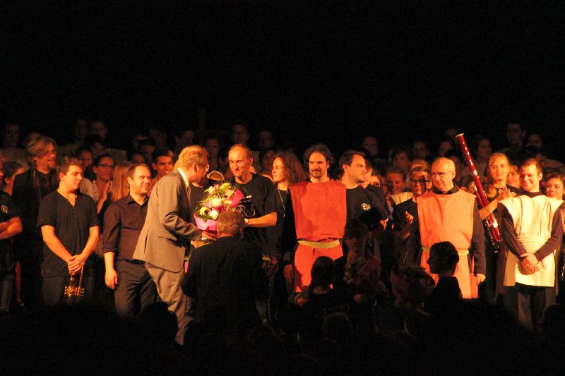 Naturgemäß wohnte viel lokale Prominenz der Welturaufführung von "Gisela und Stephan" bei. So waren neben dem stellvertretenden Landrat Anton Westner nebst Gattin natürlich Schulleiter Dietmar Boshof, sein Vorgänger Hans-Günter Gessler, Stadt- und Gemeinderäte aus Pfaffenhofen und Scheyern auch Abt Markus Eller und einige der Klosterbrüder in die Aula des Gymnasiums gekommen. Der Überlieferung zufolge soll ja die Vermählung von Stephan von Ungarn mit Prinzessin Gisela von Bayern ebendort stattgefunden haben.