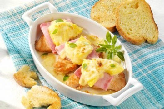 3. Erst mit Schinken, dann mit abgetropften Ananas- und Zottarellascheiben belegen. Im Backofen ca. 15 Min. überbacken. Mit Schnittlauchröllchen bestreuen und nach Belieben mit einem Salat servieren.