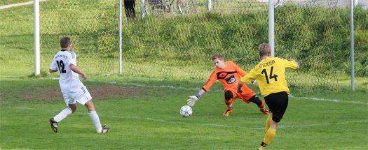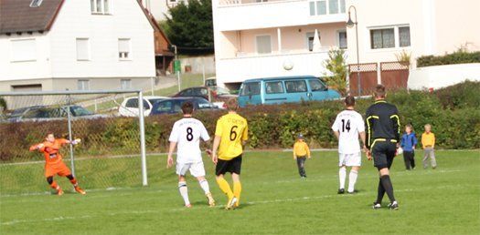 Der STS übernahm von Beginn an das Kommando. Mit einem starken kämpferischen Einsatz und Lauffreudigkeit rollten die Scheyrer Angriffe förmlich auf das Tor der Gäste, die in dieser frühen Phase des Spiels in der Abwehr nicht immer sicher standen. Mit einem sehenswerten Freistoß aus 18 Metern erzielte Nico Seepe (Bild rechts) schon in der 12. Minute die Führung, die Raphael Boser per Kopf nach Flanke Mathias Hoiss 3 Minuten später noch ausbaute.