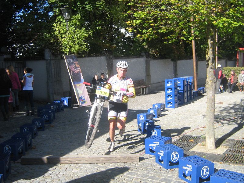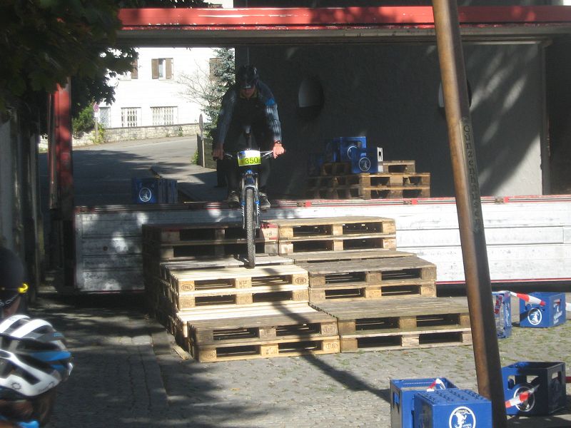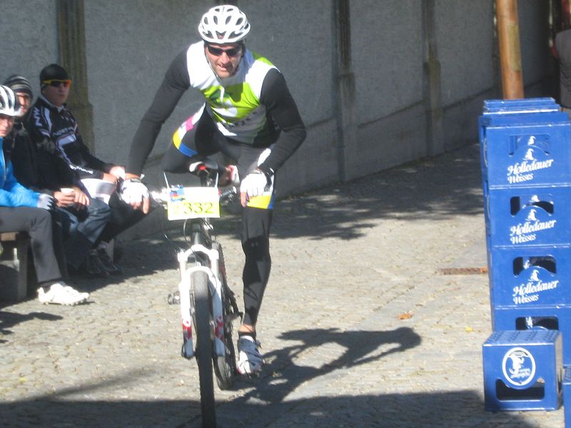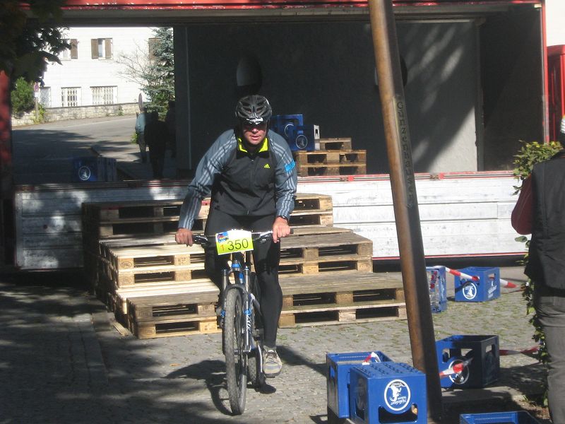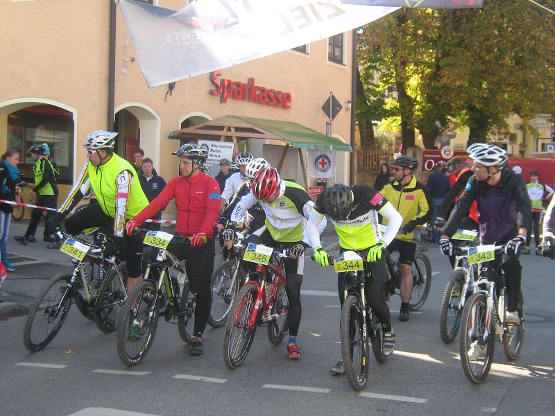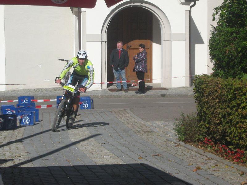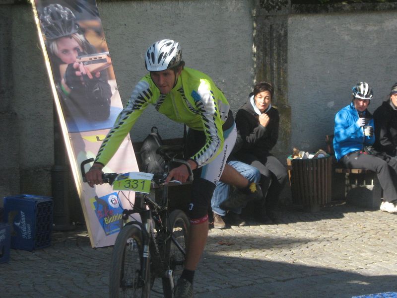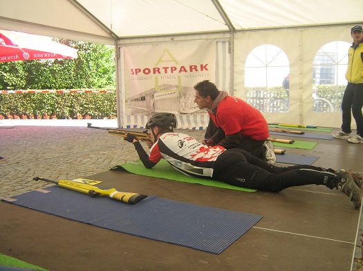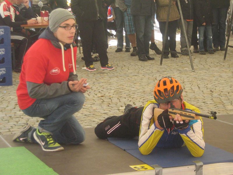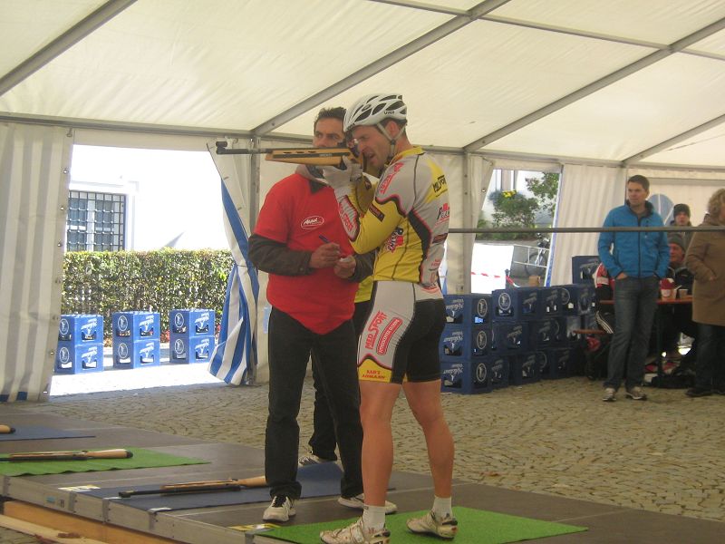 Jeder konnte mitmachen, im Endeffekt waren es aber schon meistens Sportler aus entsprechenden Vereinen, auch aus der weiteren Umgebung. Gestartet wurde in 2er Teams, in verschiedenen Klassen. Zuerst war eine 4km lange Querfeldeinstrecke zu bewältigen, teils Asphalt- und Schotterwege, aber auch Wald- und Feldwege. Start und Ziel war am Marktplatz. Dort musste nach der Radstrecke blitzschnell zum Schießen übergegangen werden, was schon, wie beim richtigen Biathlon, mit der hohen Pulsfrequenz eine Herausforderung ist. Zuerst wurde mit dem Lasergewehr im Liegen geschossen, im zweiten Teil dann auch im Stehen. Für jeden Fehlschuss gab es eine Strafrunde zu absolvieren.