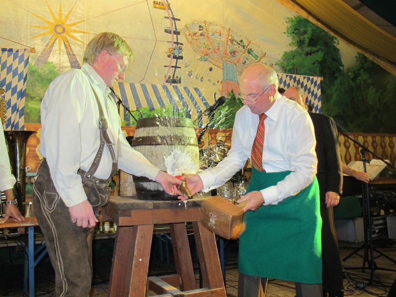 Um 19.00 Uhr machte sich dann Bürgermeister Josef Reiser an die ehrenvolle Aufgabe, anzuzapfen, was auch schon nach dem 2. Schlag gelang. Das Bier spritze und Herr Reiser verkündete stolz: „ O’zapft is!“