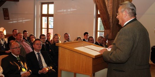 Eine kleine Handbewegung von Dr. Joachim Spiegel gleich zu Beginn seines Beitrages machte es deutlich, um was es eigentlich ging und was letztlich der Anlass war, dieses Buch zu schreiben. Ein auf den ersten Blick eher unscheinbares kleines Stück Pergament, das aber dennoch für die Historie der Hopfenmetropole überaus wichtig ist. „Es handelt sich um die erste urkundliche Erwähnung unseres Marktes“, so Dr. Spiegel, der in der neuen Chronik ausführlich darüber geschrieben hat. Diese Urkunde aus dem Jahr 814 n. Chr. war auch der Antrieb eine neue Chronik über Wolnzach zu schreiben.