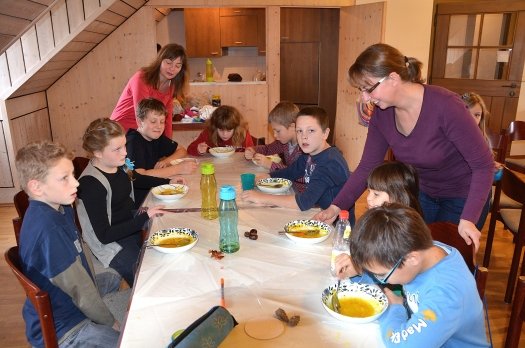 Zu Beginn gab es einen vielen bereits aus dem Kindergarten bekannten Stuhlkreis um sich erst mal kennenzulernen und alsdann fachzusimpeln über den Herbst als Jahreszeit im Allgemeinen, die Zeit der Ernte und den Erntedank. Unter der Leitung des Kindertreff-Teams mit Christine Kuplent, Marita Balling-Reng, Carola Berger und Birgit Blümlhuber ging es dann ans Schnipseln der umfangreichen Zutaten für die Gemüsesuppe. Über deren Ingredienzien - Zwiebeln, Lauch, Karotten aber auch Kartoffeln - lernten die Kinder quasi spielerisch Herkunft, Anbau und Verwendung kennen.