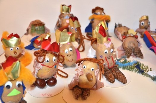 Im riesigen Einmachtopf brodelten dann gut 20 Liter Suppe vor sich hin. Bis zum Mittagessen war dann Basteln angesagt. Aus Kastanien, Eicheln, Blättern, Filz und Wollresten entstanden herrliche Kartoffelkönige mit wunderbaren Rollaugen, die auf Bierdeckeln ihren dauerhaften Halt fanden. Zwischendrin verlangte die Suppe nach Crème fraîche und Gewürzen und wurde püriert. Die selbstgemachte Gemüsesuppe schmeckte dann den Nachwuchsköchen derart gut, dass sogar eingefleischte Gemüseverweigerer schwach wurden und nach einem zweiten Teller verlangten.