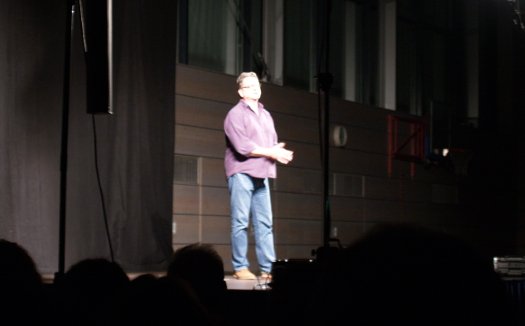 Nach einer kurzen Pause lief der Kabarettist nicht nur verbal sondern auch bewegungstechnisch zur Höchstform auf. Beim Thema „Deutsche Bahn“ schilderte er detailverliebt das Verhalten einer Reihe früherer Mitfahrer, darunter eine Gruppe pubertierender Mädchen, ein paar begeisterte Döner-Konsumenten und einen stereotypen Amerikaner, der im Zug nicht ohne seine Beingymnastik entspannen kann. Und ebendiese mit nacktem Fuß, wie könnte es auch anders sein, natürlich exakt eine Hand breit von Grünwalds Ohr entfernt praktizieren muss. Da erscheint ihm der rettende sächselnde Schaffner als Silberstreifen am Horizont.