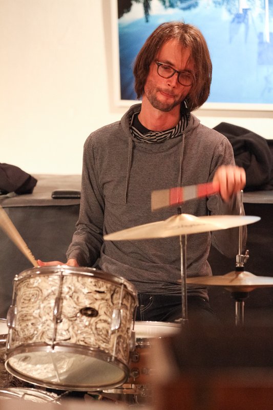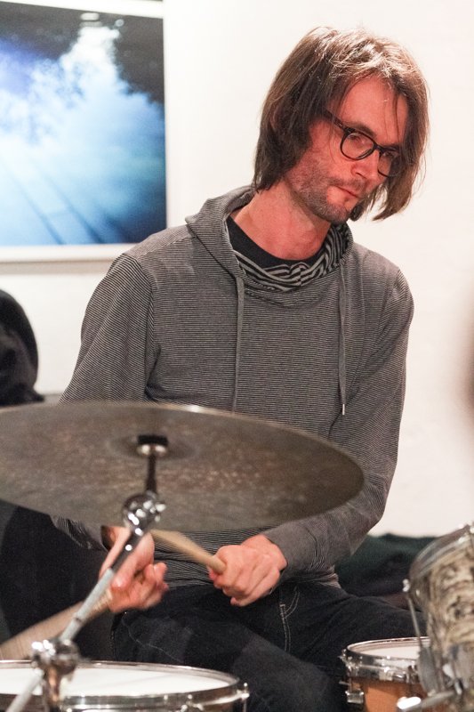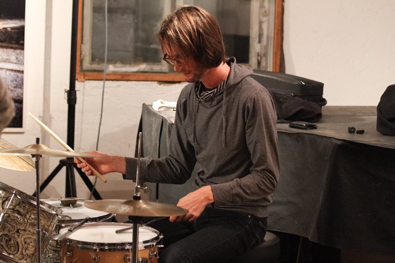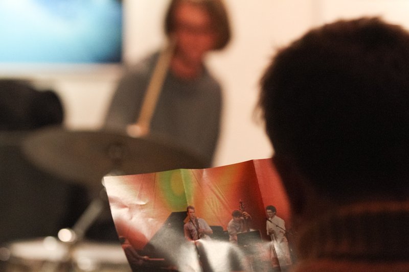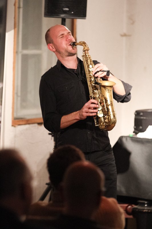 Es ist laut, laut, laut. Unruhe, die Blicke zucken umher. Worauf soll man sich konzentrieren? Seit einigen Sekunden ertönt ein Saxofon, flirrender Klang, das Schlagzeug gibt unübliche Klänge von sich, der Bass lässt ein dezent kribbelndes Gefühl im Magen zurück. Urgewaltig formt sich ein Klangmotiv, es ist unruhig im Urwald. Der Gorilla ist außer sich, impulsiv, gestört. Doch das Publikum bleibt gekonnt ruhig. Der gebürtige Kanadier und Altsaxofonist war vergangenen Freitag mit den Musikerkollegen Roland Fidezius (Bass) und Rudi Fischerlehner (Drums) in der Künstlerwerkstatt zu Gast. Ein besonderes Klangerlebnis erwartete die zahlreichen Gäste. Plötzlich wirft Rudi eine Blechscheibe auf die Standtom – was macht er da? Spitze Klänge ertönen, Fidezius nutzt seinen Bass kurzerhand als Gitarre.
