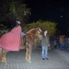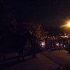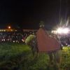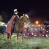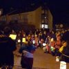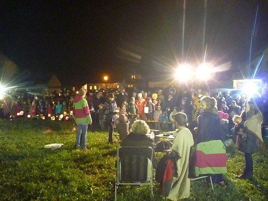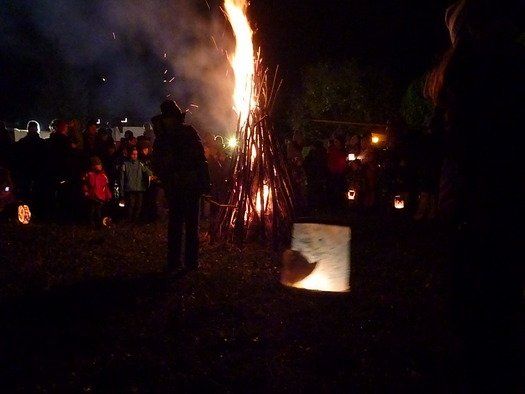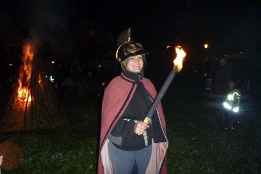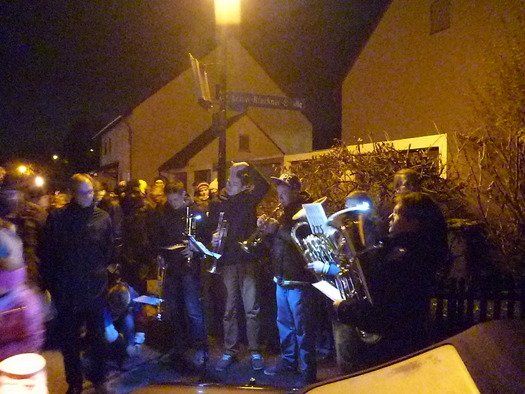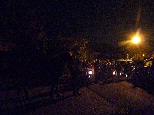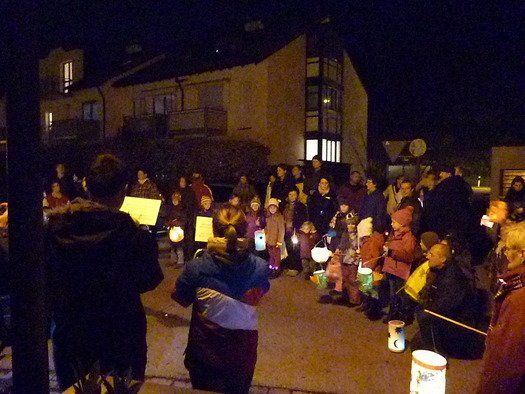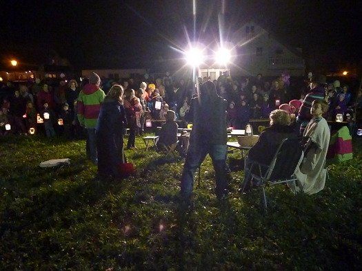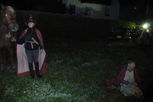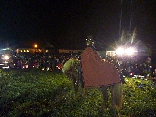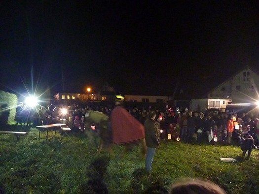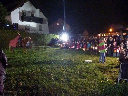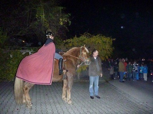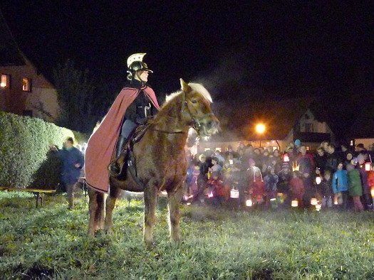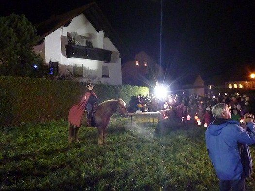 Eine scheinbar endlose Menschenmenge mit Laternen zog durch die engen Straßen des Wohngebietes zur Großen Wiese. Vorne weg ein unruhiger Haflinger nebst verkleideter Reiterin und kräftiger männlicher Führung. Die Trompetenklänge und Lieder waren wohl nicht unbedingt sein Geschmack, erst auf der Wiese zeigte er brav seine Qualitäten. Ein Rollenspiel um die Geschichte des Heiligen Martin der Kindergartenkinder endete erwartungsgemäß mit der berühmten Mantelteilungsszene.