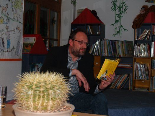 Er saß ganz ungezwungen auf der kleinen Treppe in der Leseecke der Gemeindebücherei und meinte lachend, „ich werde heute ein paar meiner Lieblingspassagen vorlesen, wobei ja alle meine Passagen Lieblingspassagen sind.“ Der Titel des Buches heißt „Tetaphrate“, man weiß aber auch nach dem Lesen des Buches nicht, wer eigentlich Tetaphrate ist. Die Geschichte handelt von dem Münchner Geheimagent Alfons Dirnberger, der von seinem Chef, seinem Job und seinem Leben die Schnauze voll hat. Als Gemüseverkäufer getarnt arbeitet er für den unwichtigsten Geheimdienst der Welt, bis ein Diebstahl im Ägyptischen Museum für Aufregung sorgt. Plötzlich sieht er sich in einer mörderischen Melange aus Verrat, Korruption, Unfähigkeit und dem Formular M82 gegenüber.