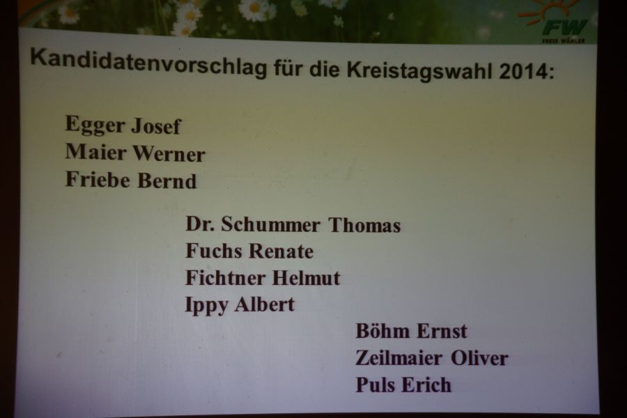 Nach einer kurzen Pause stellten sich die neuen Stadtrats- und Kreistagskandidaten vor und Altbürgermeister Josef Egger hielt noch eine kurze Rede, in der er seine Partei und Bernd Friebe in allen Punkten beipflichtete.
