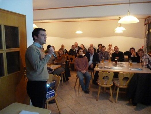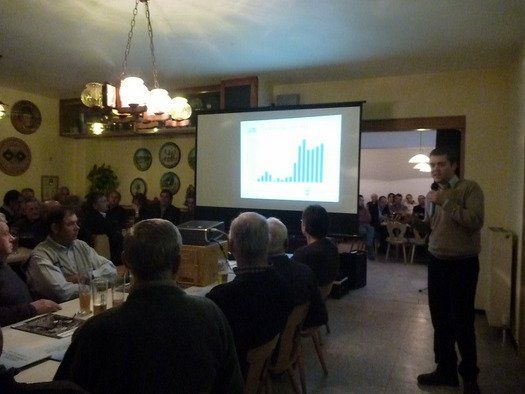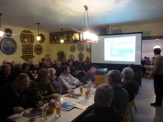 Gut 100 Minuten Zahlen Daten und Fakten, zwei neue Image Filme und das Ganze auf zwei Leinwänden in der relativ kleinen Wirtsstube, die größtenteils männliche, gemütliche Zuhörerschaft hatte sichtbar Mühe, dem gigantischen Zahlenwerk von Bürgermeister Thomas Herker zu folgen.