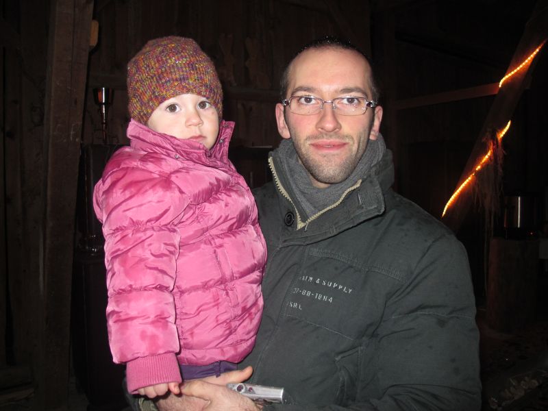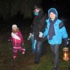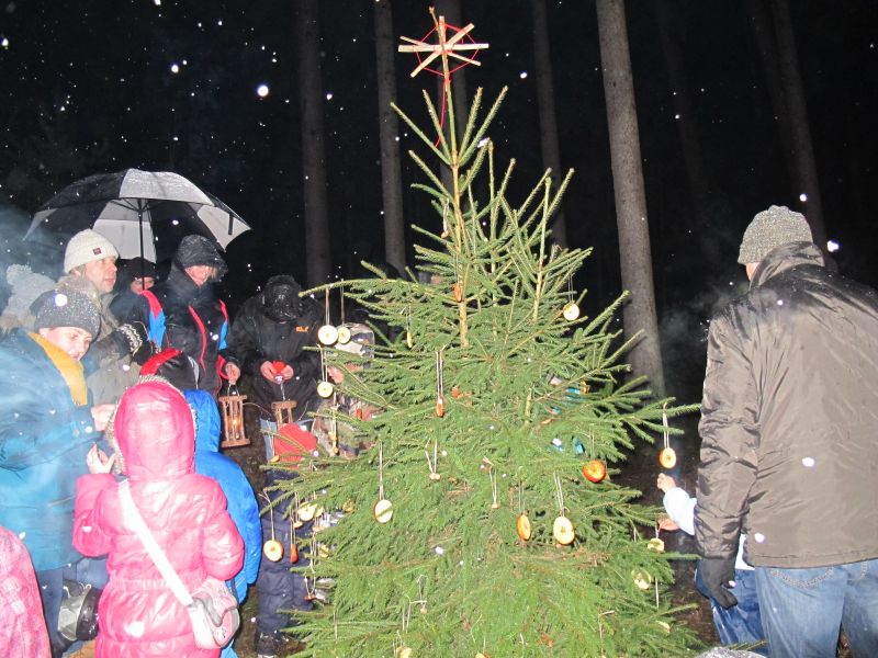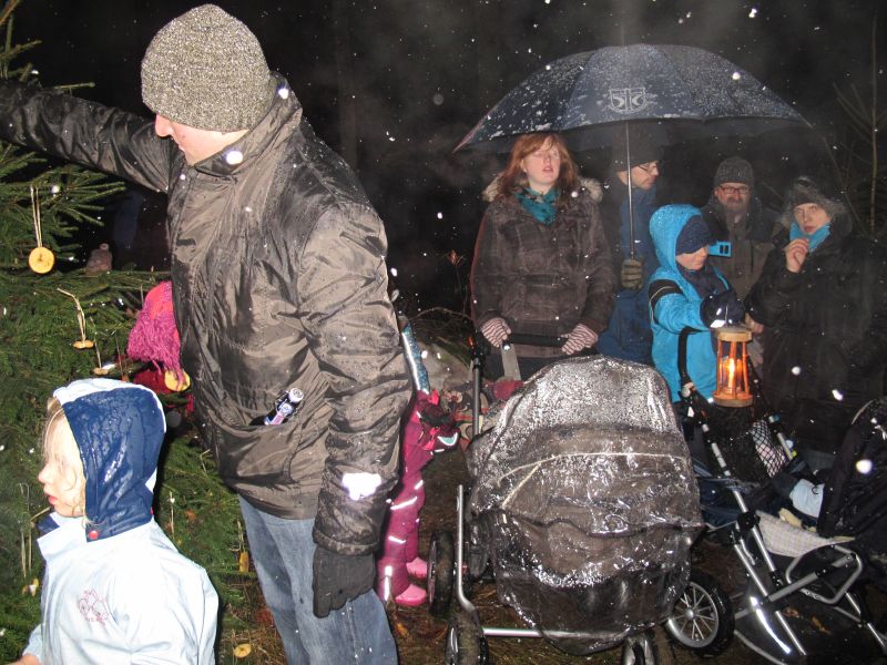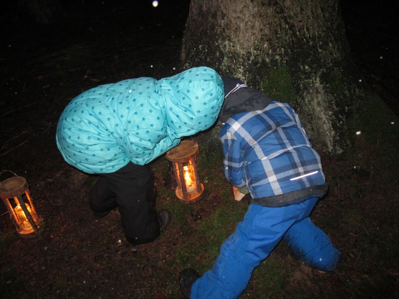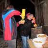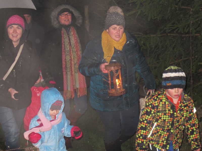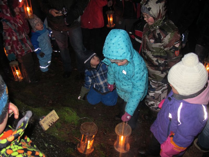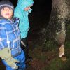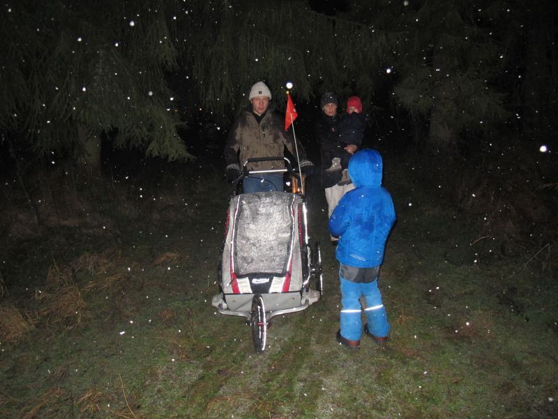 Mit Laternen „bewaffnet“ und natürlich dem Bier und dem kleinen Glas, zog die ganze Gesellschaft im Stockdunklen und bei leichtem Schneefall in den nahen Wald. Dort angekommen, wurde erst mal der Waldmaus ein Besuch abgestattet und sie bekam auch das versprochene Glas Bier.