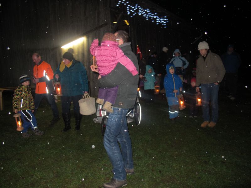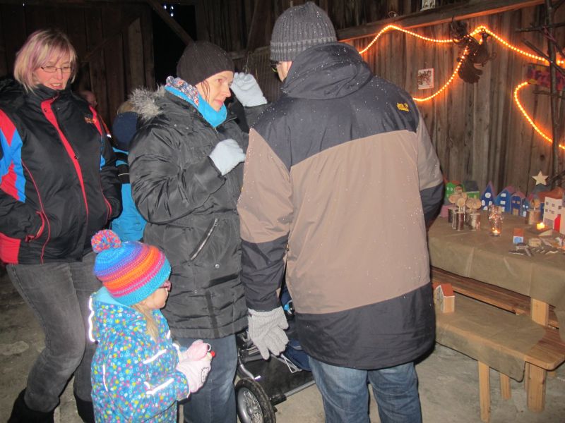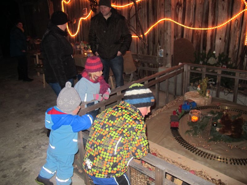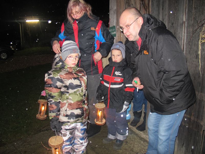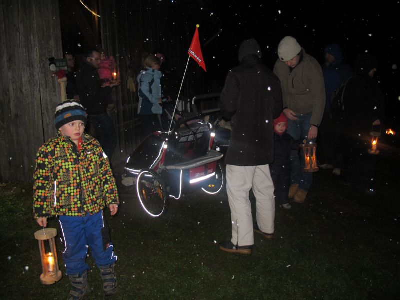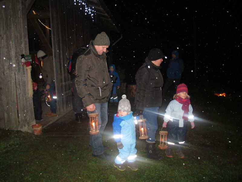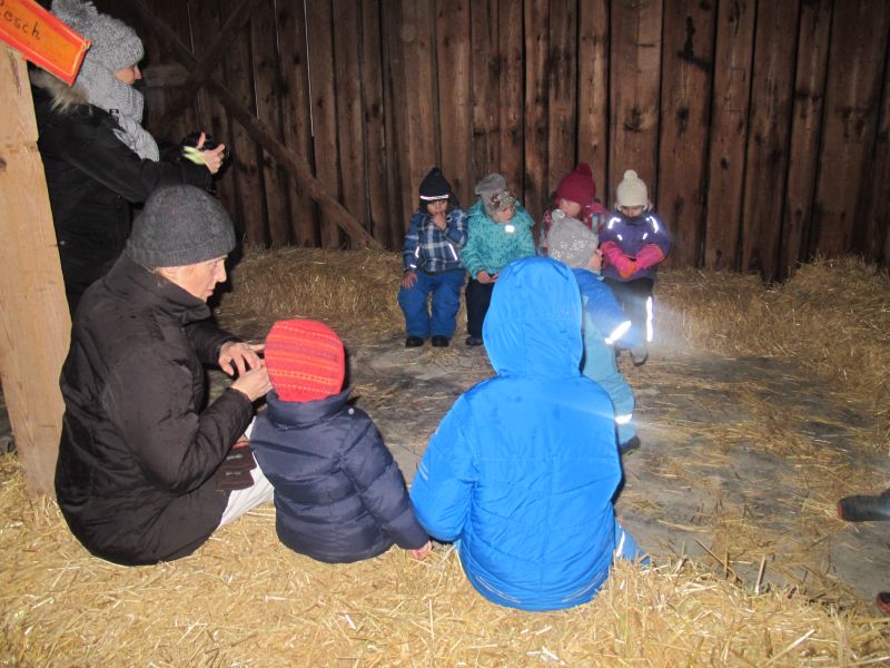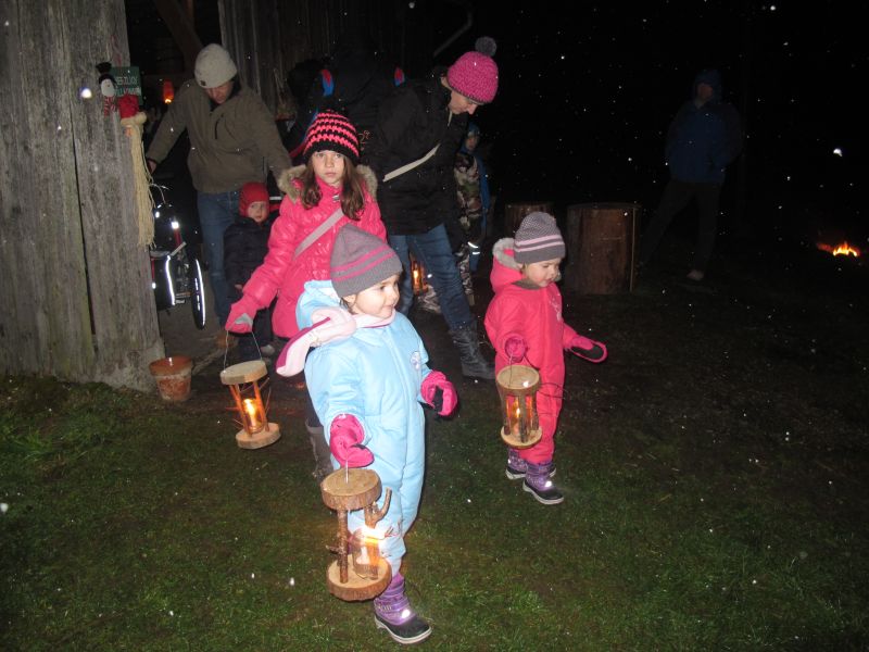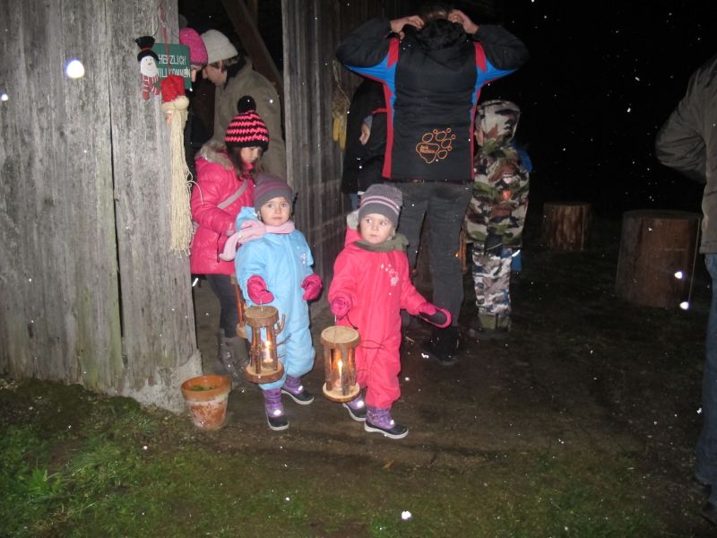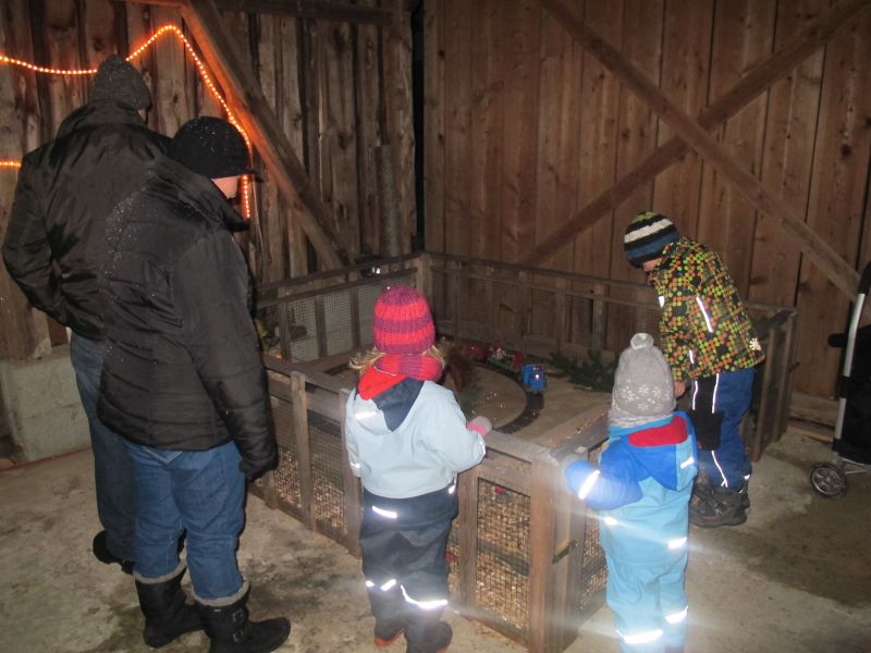 An die 25 Kinder von 0 – 9 Jahren waren mit ihren Eltern zu Besuch bei der Familie Resch, die wie immer alles sehr liebevoll für ihre Gäste vorbereitet hatte. Im romantischen Stall standen Laternen für die Wanderung in den nahen Wald bereit, eine Holzstadt konnte von den Kleinen bewundert werden und eine Eisenbahn zog ihre Kreise.