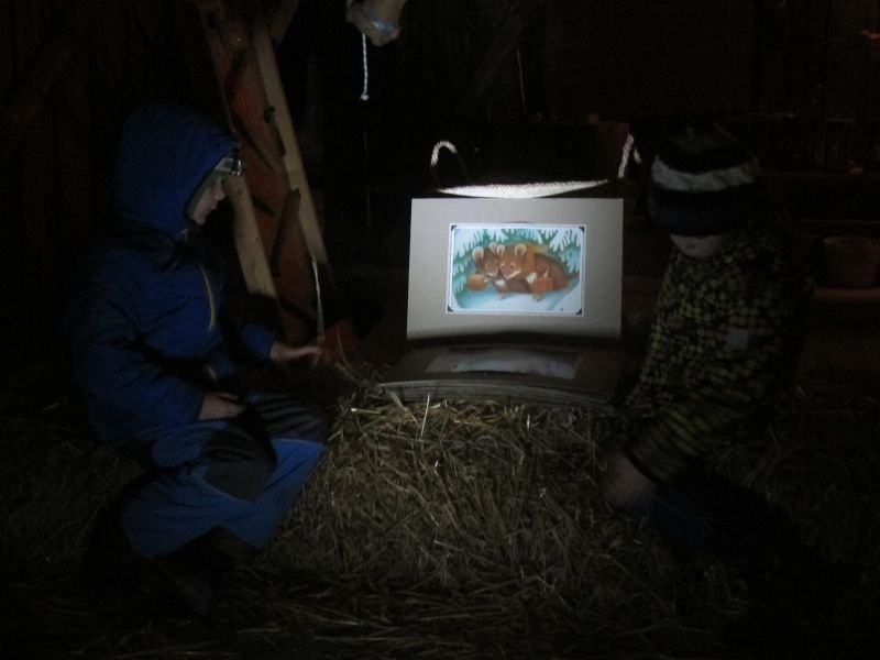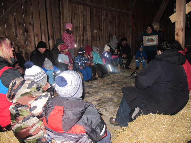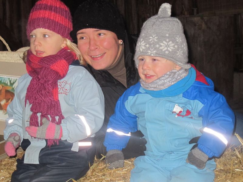 Als alle Gäste eingetroffen und der festlich geschmückte Stall ausgiebig bestaunt worden war, durften es sich alle auf Strohballen bequem machen. Frau Resch las die Geschichte von der „Waldmaus und Hausmaus“ und da wurde es mucksmäuschenstill. Ob Kinder oder Erwachsene, jeder lauschte aufmerksam, wie es der Waldmaus erging, als sie zu Besuch bei der Hausmaus war.