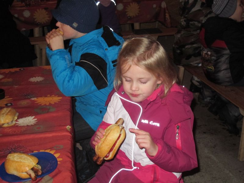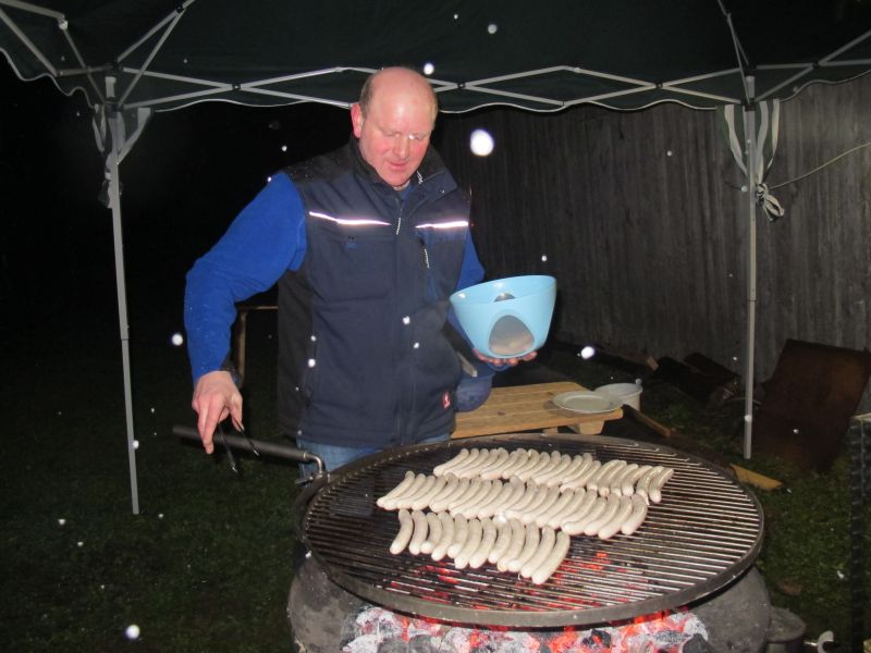 Ziemlich durchgefroren marschierten die fleißigen Helfer des Christkinds wieder zurück in den warmen Stall und wurden dort von leckerem Geruch erwartet. Herr Resch hatte in der Zwischenzeit den Grill angeheizt und die ersten Schweinswürschtel waren schon fertig, auch Kinderpunsch und frische Kierchen waren bereit gestellt.