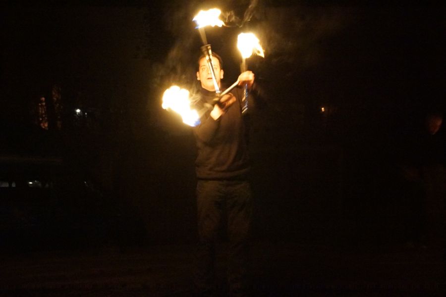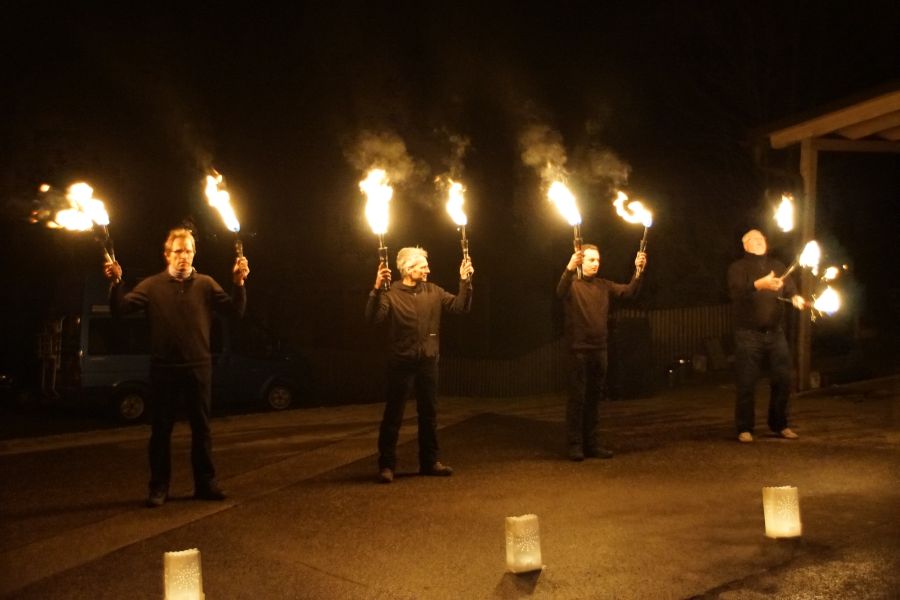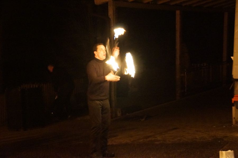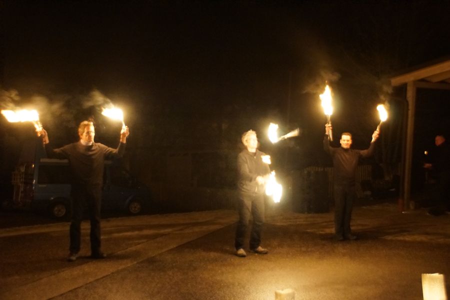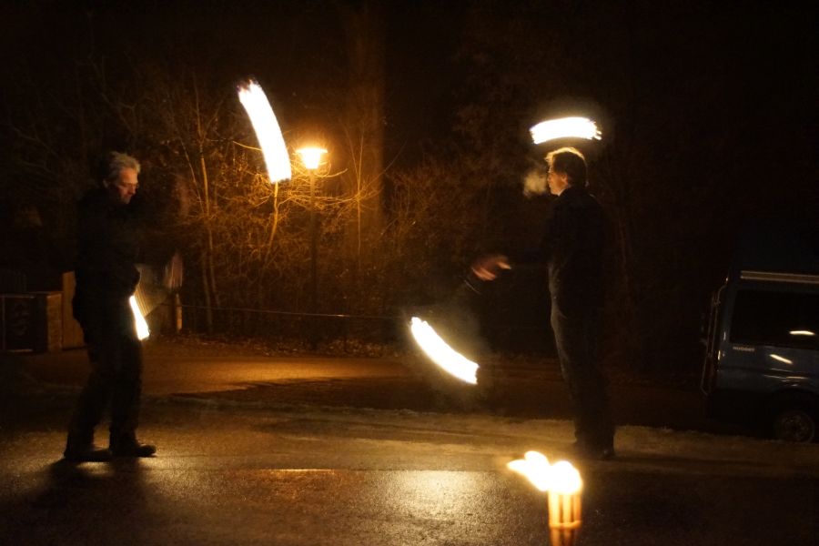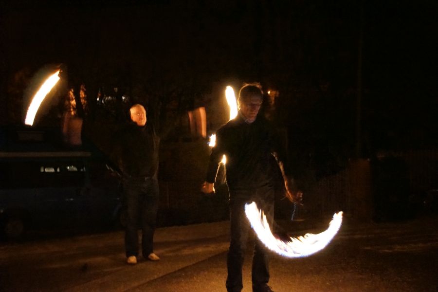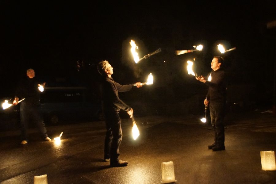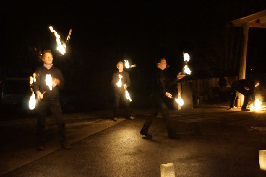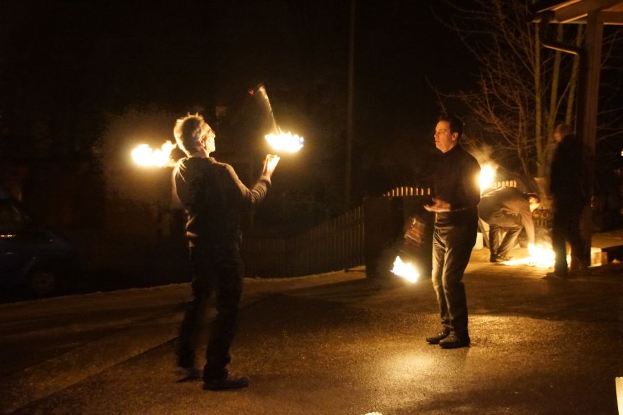 Um kurz nach 23.00 Uhr ging es nach draußen. Dort wartete bereits „Dorfjongleur“ Sebastian Kolmeder, gemeinsam mit Elmar Ederer, Willi Meierbeck und Helmut Hellmich, die „Juggle Fire“ mit einer faszinierenden Feuershow.