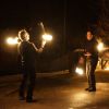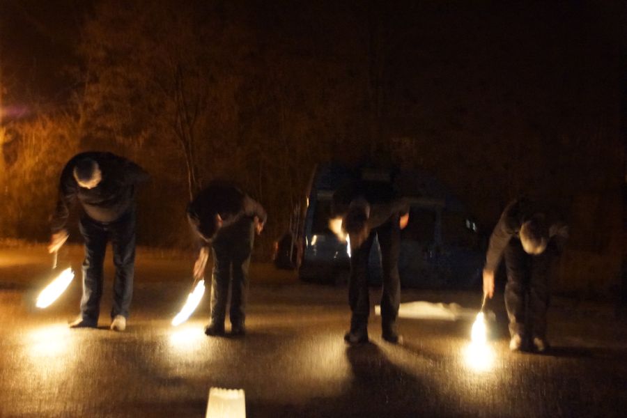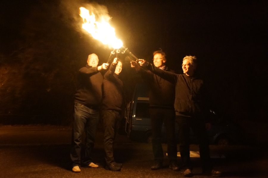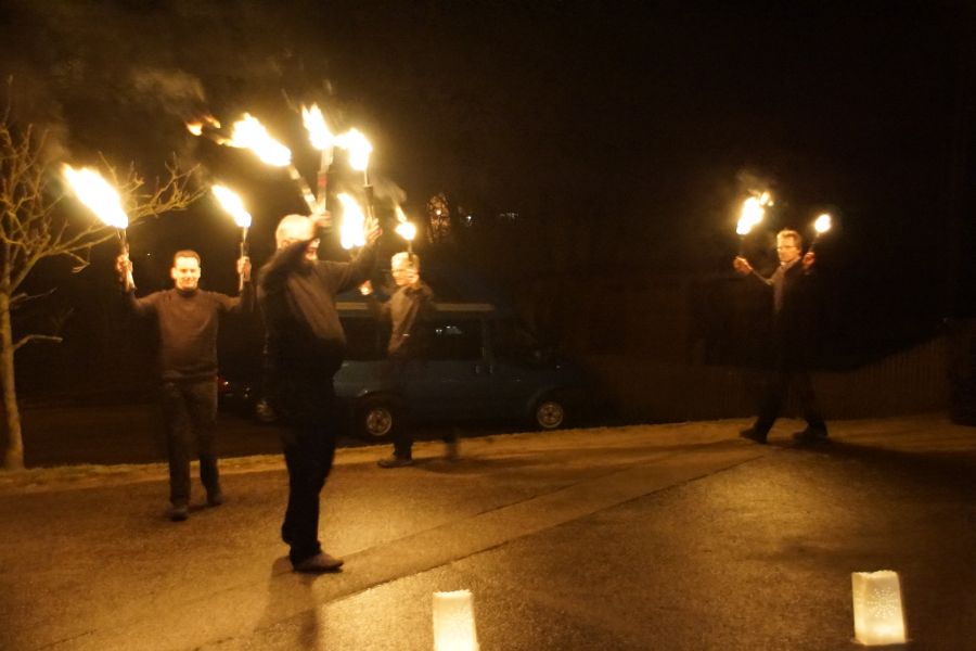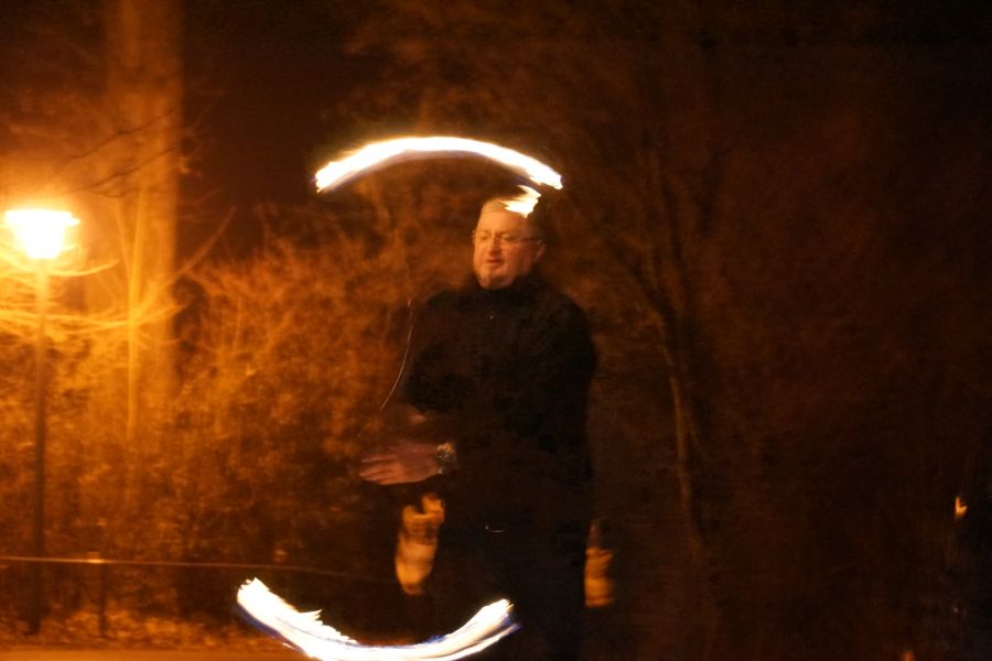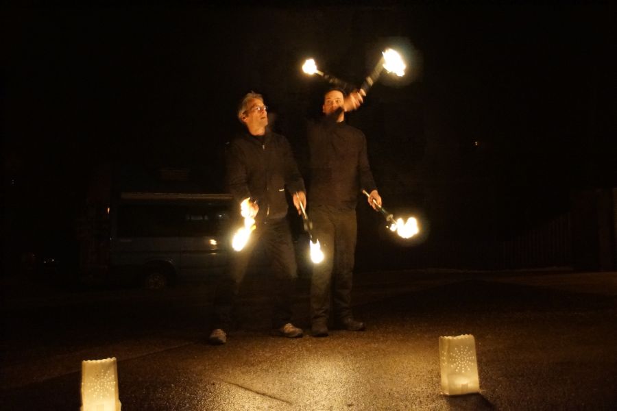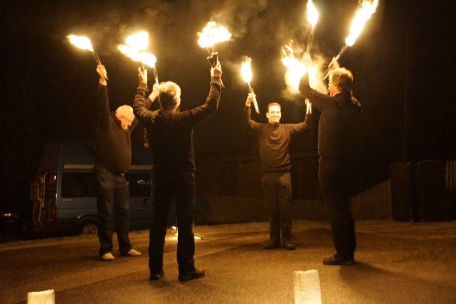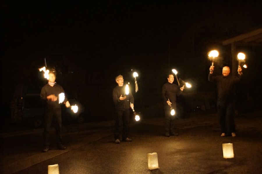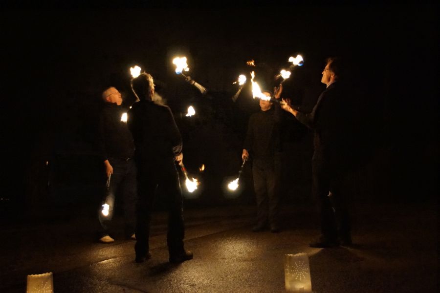 Um kurz nach 23.00 Uhr ging es nach draußen. Dort wartete bereits „Dorfjongleur“ Sebastian Kolmeder, gemeinsam mit Elmar Ederer, Willi Meierbeck und Helmut Hellmich, die „Juggle Fire“ mit einer faszinierenden Feuershow.