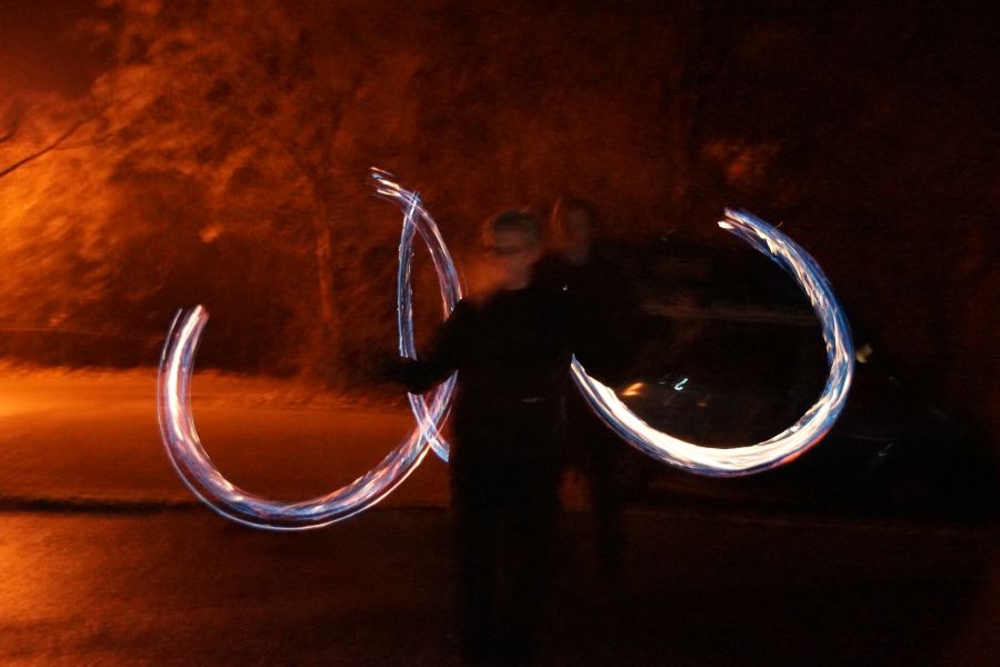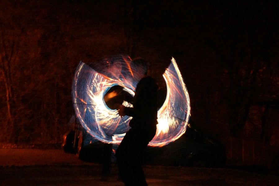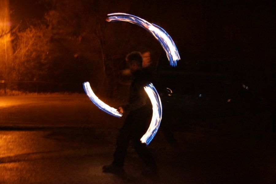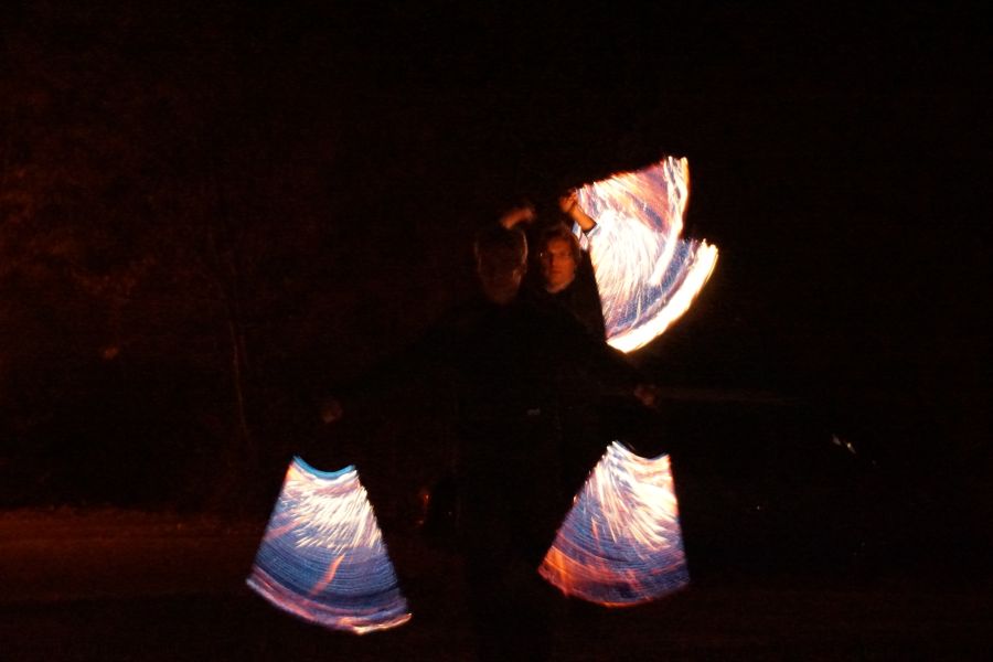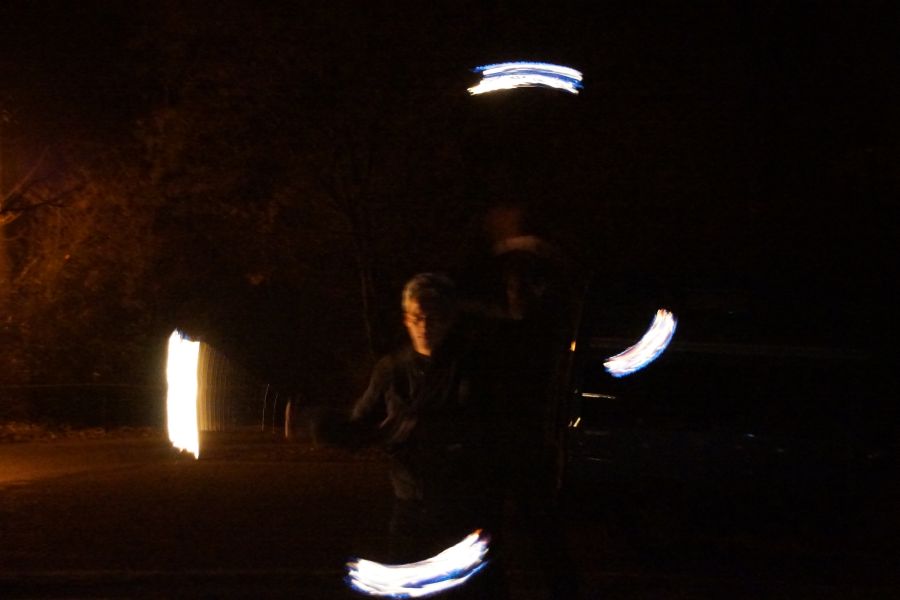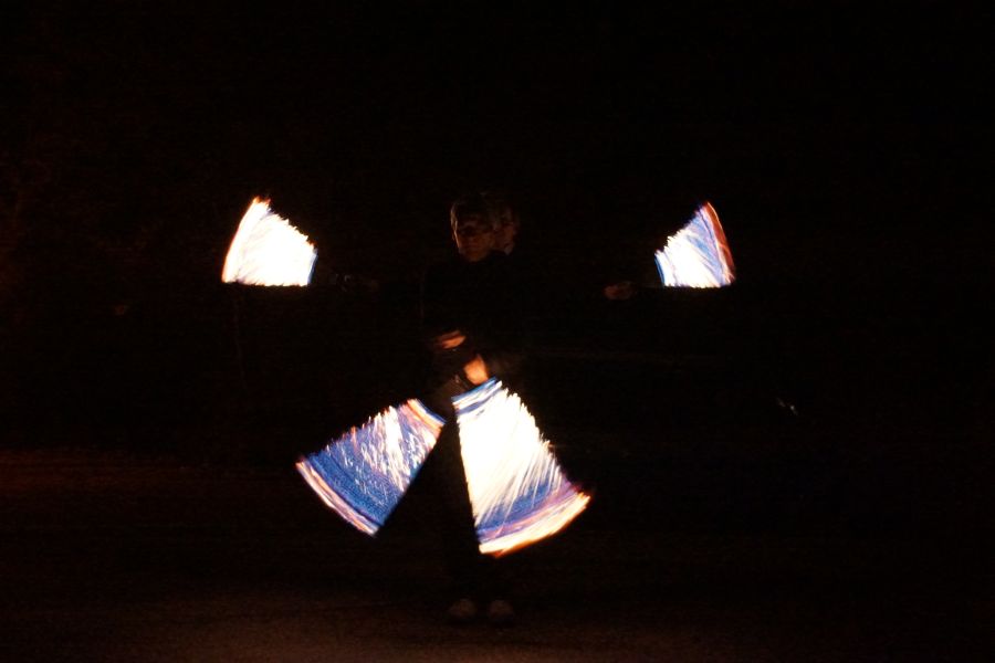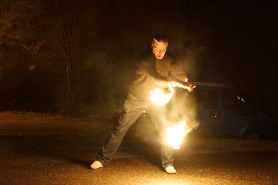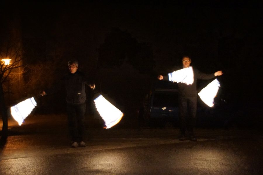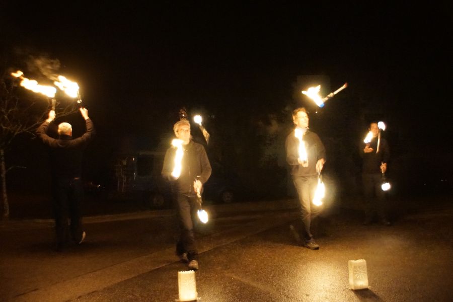 Um kurz nach 23.00 Uhr ging es nach draußen. Dort wartete bereits „Dorfjongleur“ Sebastian Kolmeder, gemeinsam mit Elmar Ederer, Willi Meierbeck und Helmut Hellmich, die „Juggle Fire“ mit einer faszinierenden Feuershow.