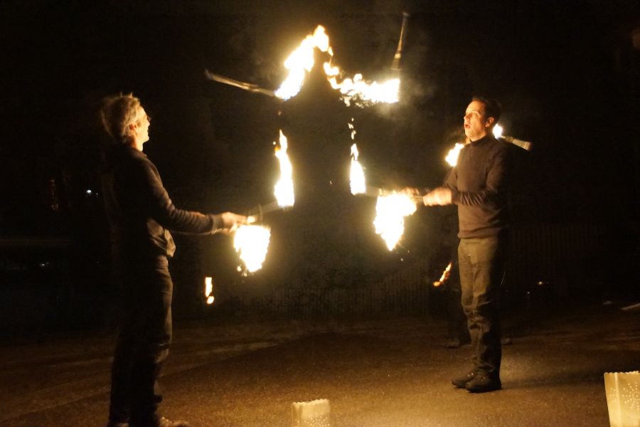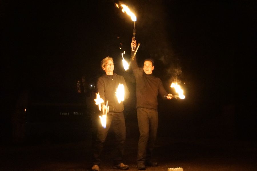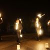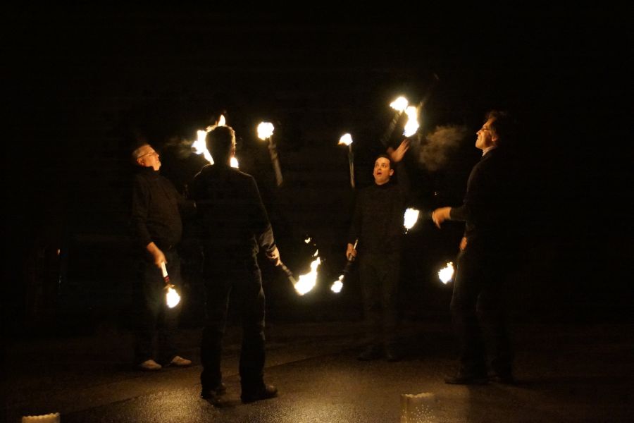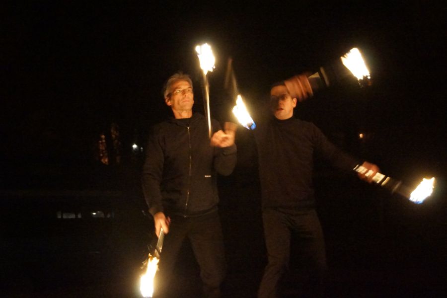 Brennende Fackeln wurden wie harmlose Jonglierbälle von den vier Künstlern hoch in die Luft geschleudert, hin und her geworfen und schließlich zu einem einzigen riesigen Feuer vereint.