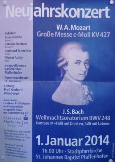 Auch 2014 luden der Landkreis Pfaffenhofen und der Pfaffenhofener Kammerchor wieder zu einem Jahresauftakt mit klassischer Musik ein, der am 1. Januar 2014 um 16 Uhr in der Stadtpfarrkirche stattfand. Die c-moll-Messe gilt neben dem Requiem als eines der eindrucksvollsten kirchenmusikalischen Werke Mozarts. Als glanzvoller Auftakt war zuvor die vierte Kantate aus Bachs Weihnachtsoratorium zu hören.