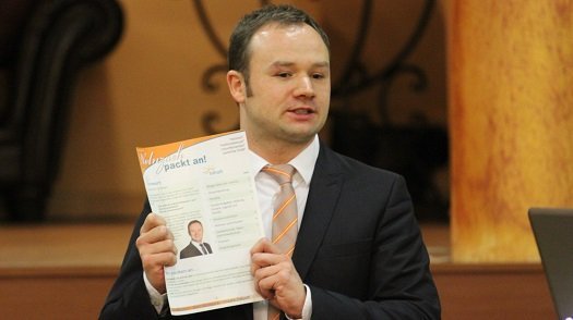 Mit diesem Worten übergab er das Mirko an den Bürgermeisterkandidaten. In einer rund halbstündigen Rede mache der 29-jährige nicht nur deutlich, warum er trotz seiner mangelnden politischen Erfahrung, der Richtige für das Amt sei. „Ich habe die richtige Ausbildung und Finanzen kann man immer brauchen“, so Werther.