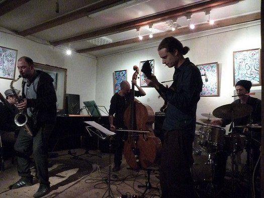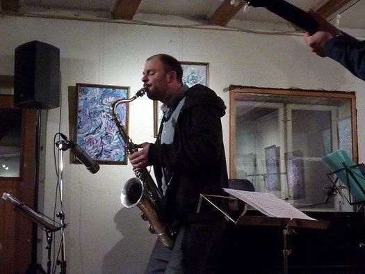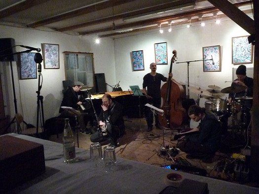 Die Schweizer waren in die Hallertau gekommen um ihre neue CD einzuspielen. Was bot sich besser an als ein gemütlicher Ort mit guter Akustik, fachkundigem Publikum, und praktischerweise, einem auf der Welt vielleicht einmaligem, analogen Tonstudio, nebenan. Das Publikum ist wie gesagt, sehr fachkundig und begeisterungsfähig, der Ort, Wacki´s Schreinerwerkstatt, nebst eingebautem Galeriebetrieb, eine Oase für jeden experimentierfreudigen Jazzer. Das Konzert konnte beginnen.