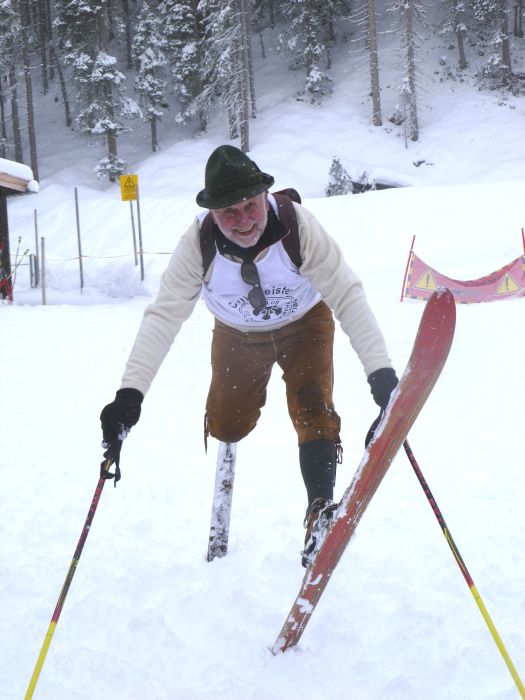 Viele der früheren Sieger starteten auf dem kurzen Parcours - und was sie da an nostalgischer Ausrüstung aufboten, war wirklich sehenswert: So reichte die Palette von uralten Holzskiern mit Lederbindung bis zum rund zwei Meter langen Siegerski aus den 80er Jahren; die Bekleidung variierte von der Lederhose mit „Wadlstrümpfen“ und Schnürstiefeln über Overall bis hin zum - etwas eng gewordenen - Rennanzug aus vergangen Jahren. Die zahlreichen Zuschauer bejubelten jeden der Clubmeister, die in ihre Fahrt noch zusätzliche „Showeffekte“ einbauten und somit sehr für Stimmung sorgten.