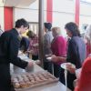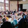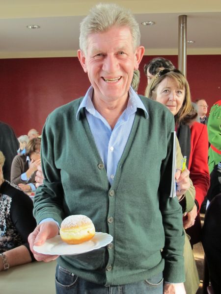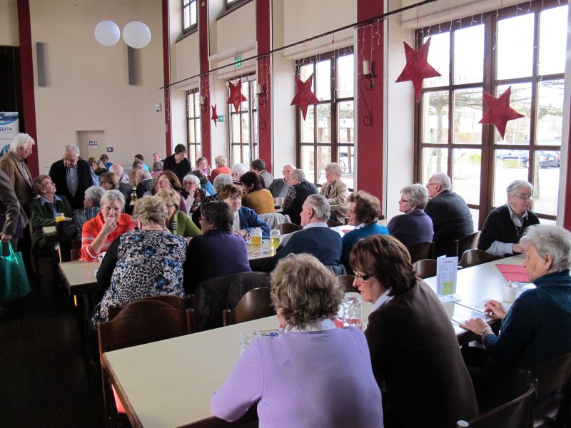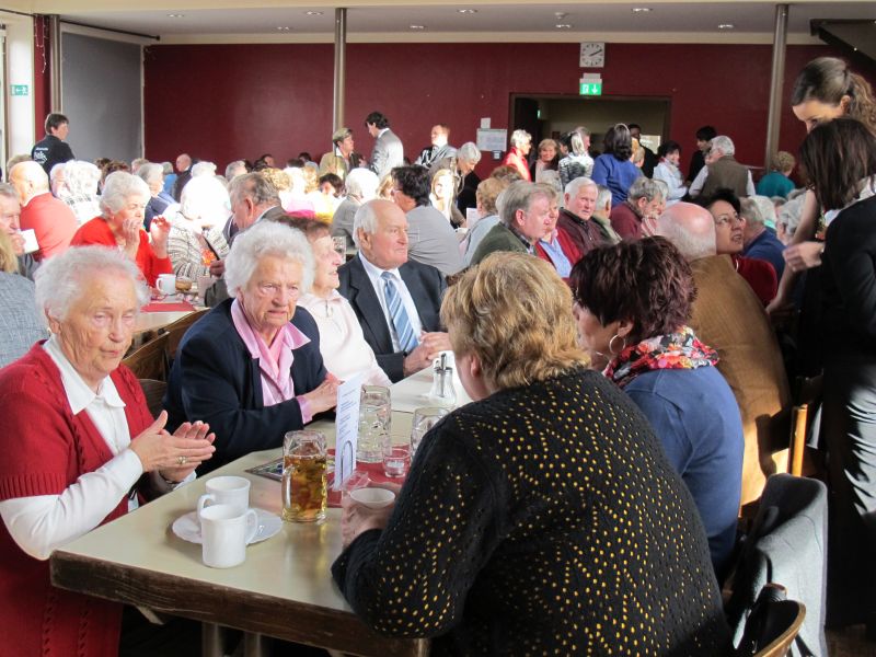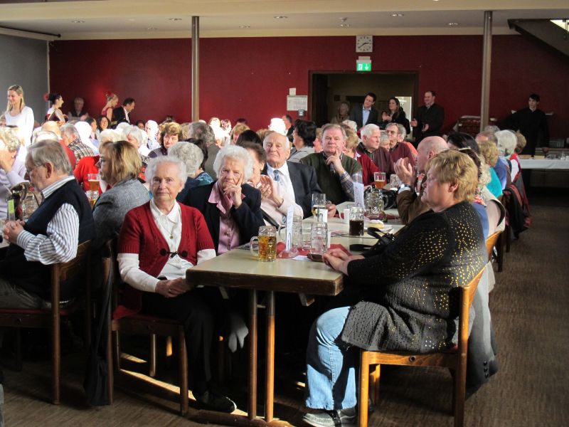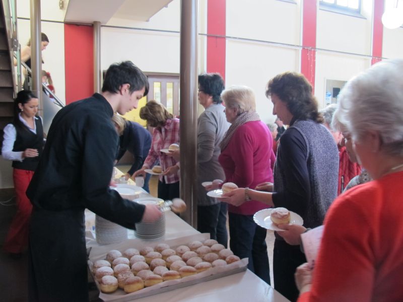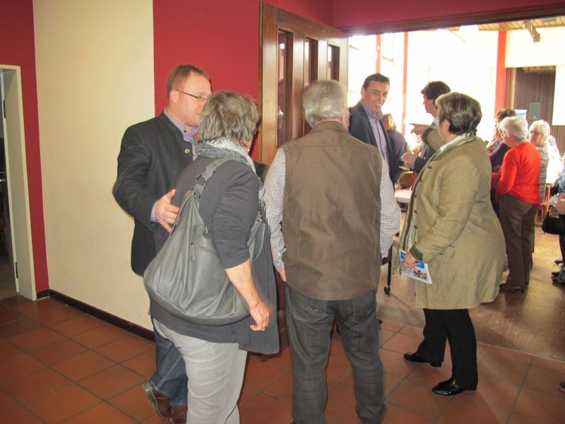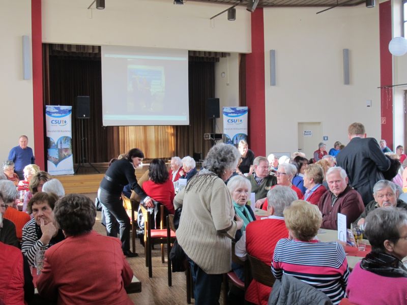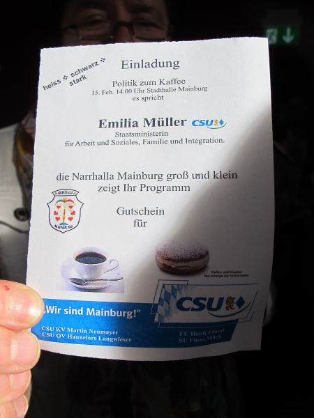 Mit einem kräftigen Händedruck wurde jeder Gast herzlich willkommen geheißen und erhielt zudem einen Gutschein für eine heiße, starke, Tasse schwarzen Kaffee dazu einen frischen Krapfen. Zahlreiche, vor allem ältere Mainburger Bürger, drängten in die Stadthalle und füllten diese bis auf den letzten Platz.