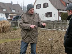 Auch der Fachwart des Gartlervereins Reichertshausen, Anton Westermeier, griff zur Astschere und zeigte, wie man es richtig machen sollte. Das größte Problem, so Schlinsog, bei den meisten Laien sei, dass sie einfach alle Äste um ein gewisses Maß zurückschnitten, " wie einen Bonsai". Dadurch wüchse aber der Baum unkontrolliert in die Höhe und Breite, verzweige sich zu stark, so dass kein Licht ins Innere des Blätterdaches falle. Wichtig sei, nur gewisse Leitäste stehen zu lassen, die einjährigen Triebe möglichst durch Gewichte oder Einspreitzen in die Waagrechte zu bringen, weil an ihnen dann das Fruchtholz entstehe.