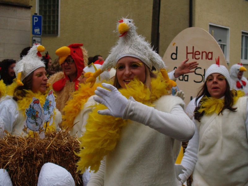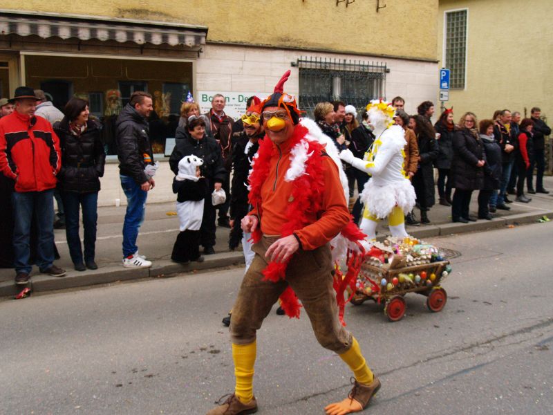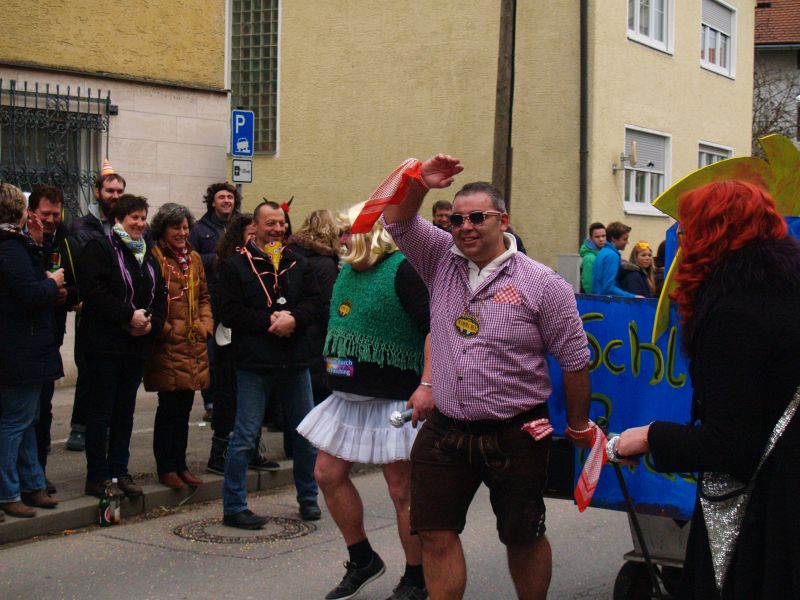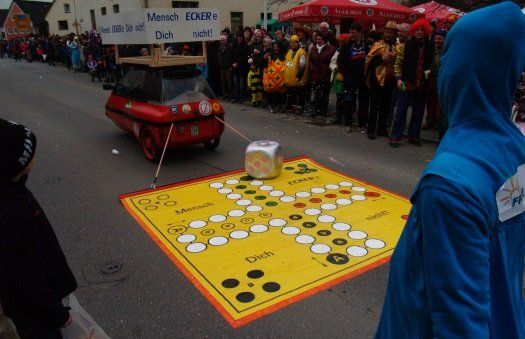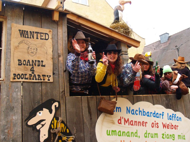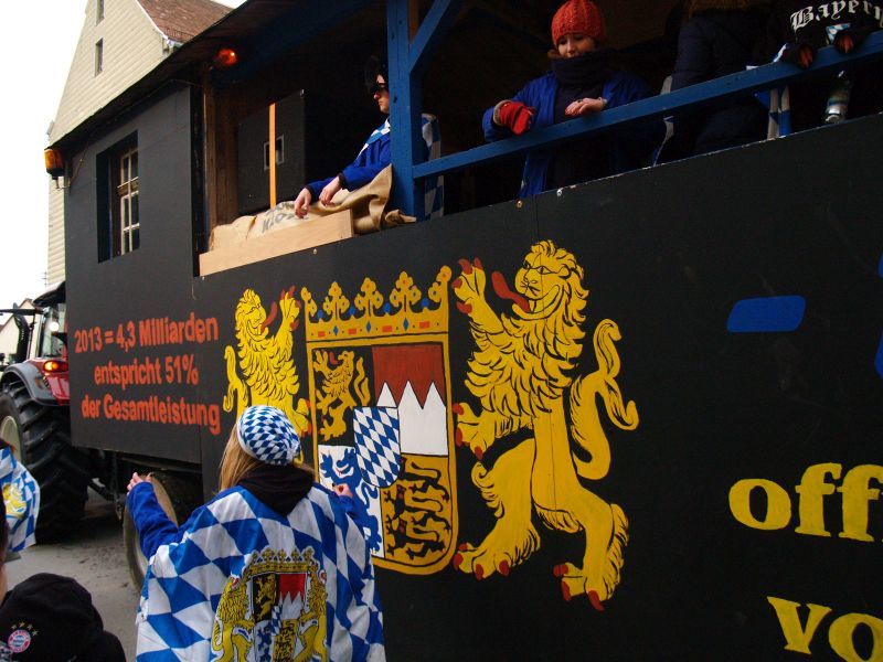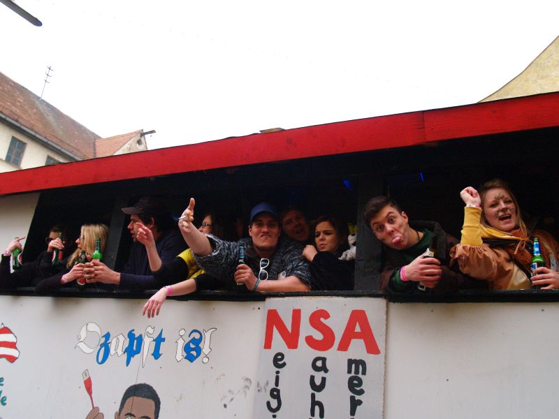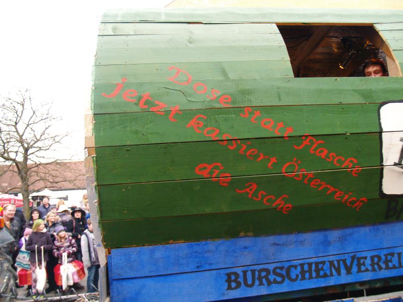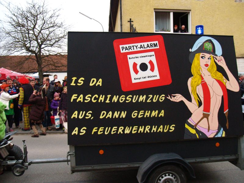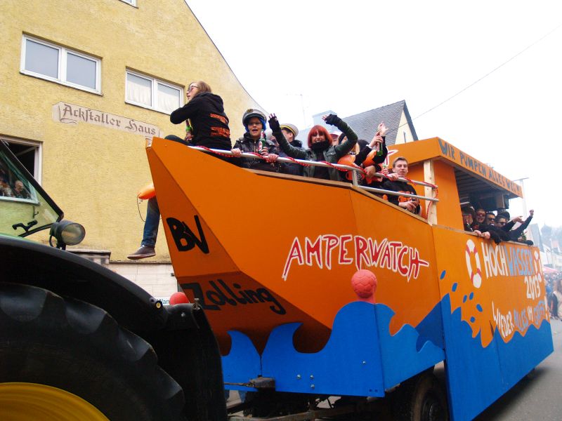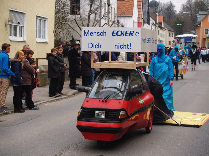 Trockenen Fußes und bei angenehmen Temperaturen starteten um 13.30 Uhr die ersten Wagen. Und die Teilnehmer haben sich natürlich wieder vieles einfallen lassen. Geeignete Mottos fanden sich beim Limburger Bischof Tebartz van Elst, beim amerikanischen Geheimdienst NSA und der bevorstehenden Kommunalwahl. Die GOL (Grüne offene Liste) war als Mensch-Ärgere-Spiel unterwegs „Mensch ECKERe Dich nicht!“ Das Gegenspiel dazu war der Slogan „Wer Ecker nicht wählt bekommt Prügl“. Aufgefallen sind auch die gruseligen Masken der Perchten und Hexen, da schreckte schon mancher zurück, wenn sie ihren Besen schwangen. Fehlen durften auch die Burschenvereine aus den Nachbargemeinden nicht, die auf ihren riesigen Wägen Party machten.
