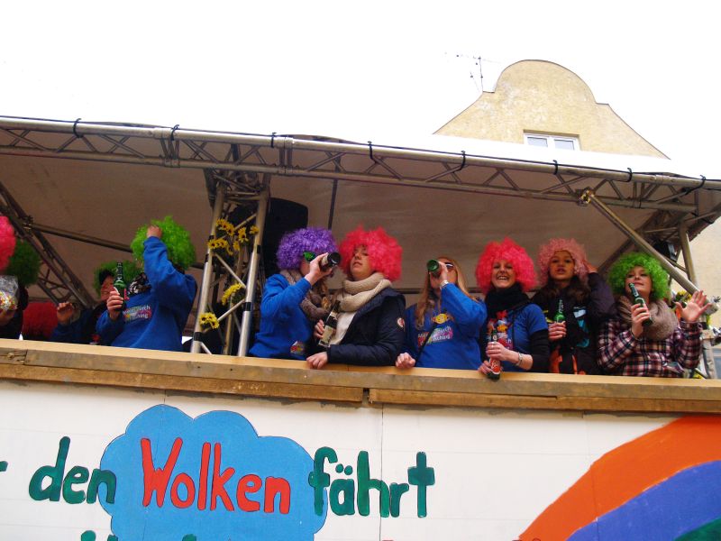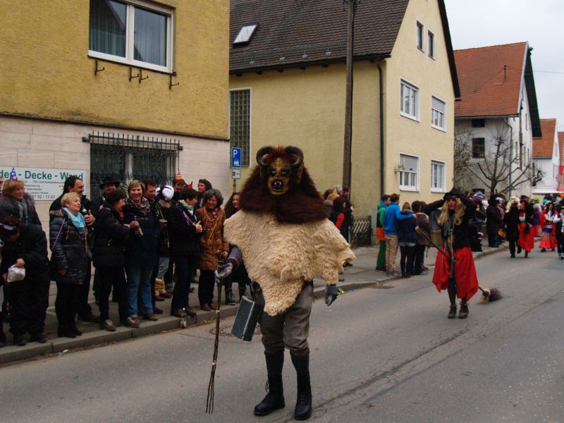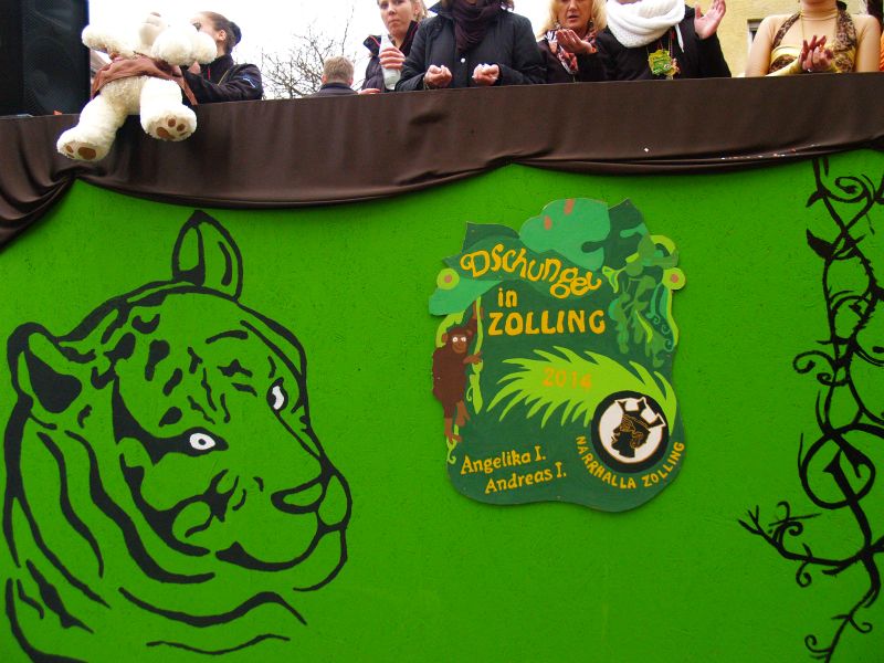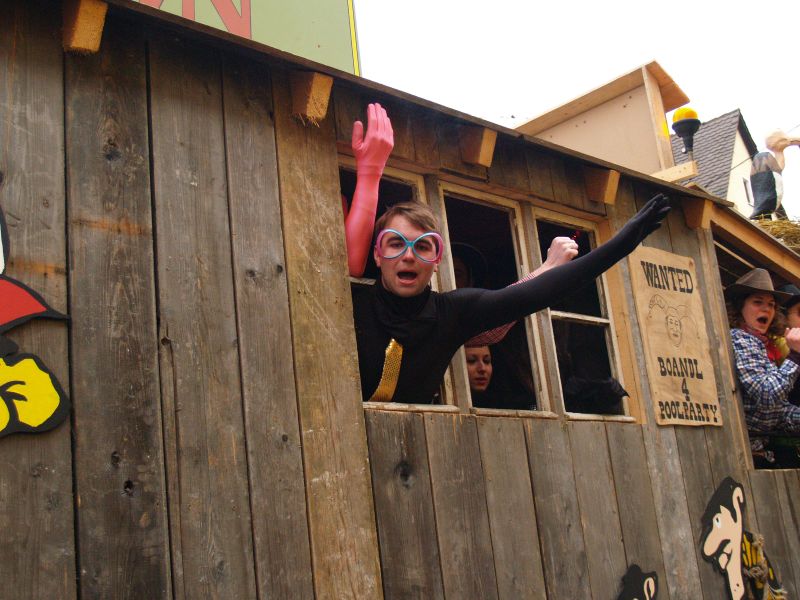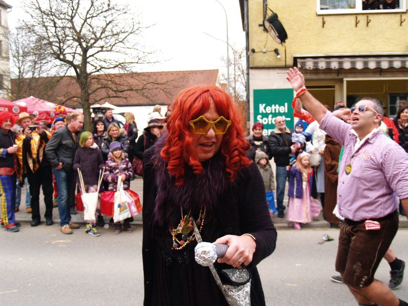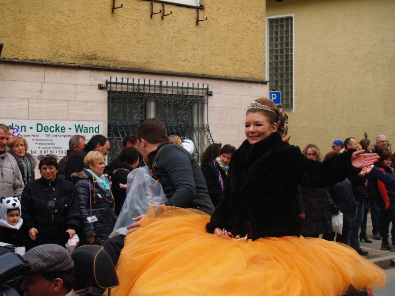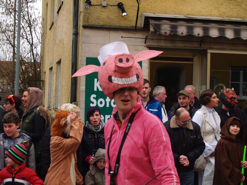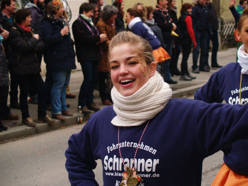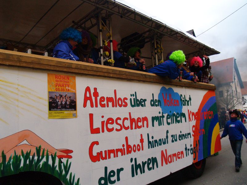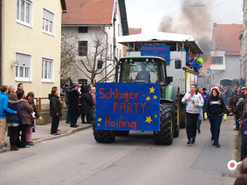 Trockenen Fußes und bei angenehmen Temperaturen starteten um 13.30 Uhr die ersten Wagen. Und die Teilnehmer haben sich natürlich wieder vieles einfallen lassen. Geeignete Mottos fanden sich beim Limburger Bischof Tebartz van Elst, beim amerikanischen Geheimdienst NSA und der bevorstehenden Kommunalwahl. Die GOL (Grüne offene Liste) war als Mensch-Ärgere-Spiel unterwegs „Mensch ECKERe Dich nicht!“ Das Gegenspiel dazu war der Slogan „Wer Ecker nicht wählt bekommt Prügl“. Aufgefallen sind auch die gruseligen Masken der Perchten und Hexen, da schreckte schon mancher zurück, wenn sie ihren Besen schwangen. Fehlen durften auch die Burschenvereine aus den Nachbargemeinden nicht, die auf ihren riesigen Wägen Party machten.
