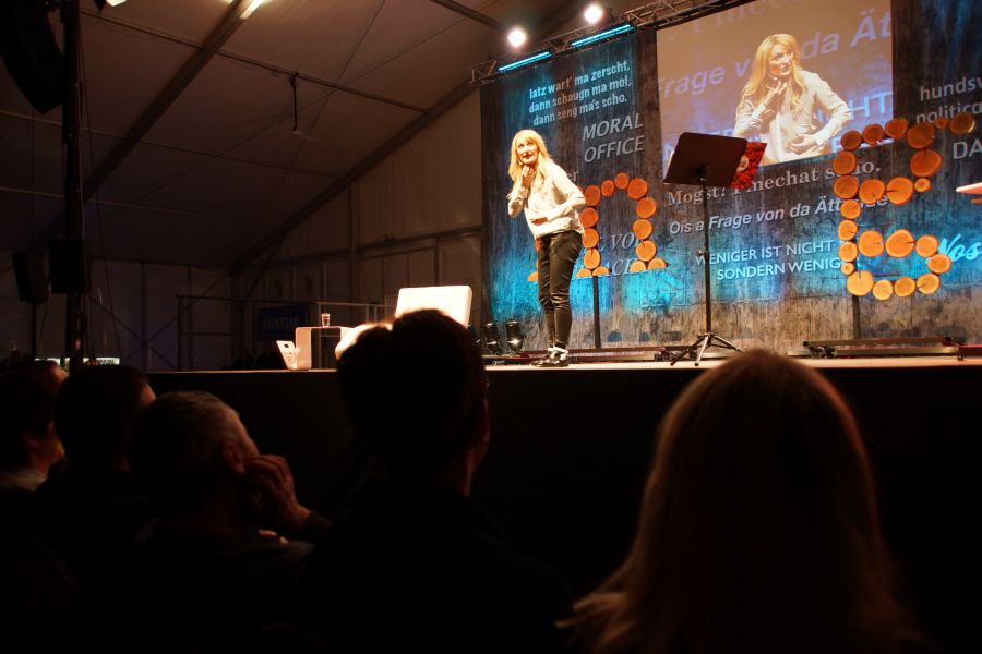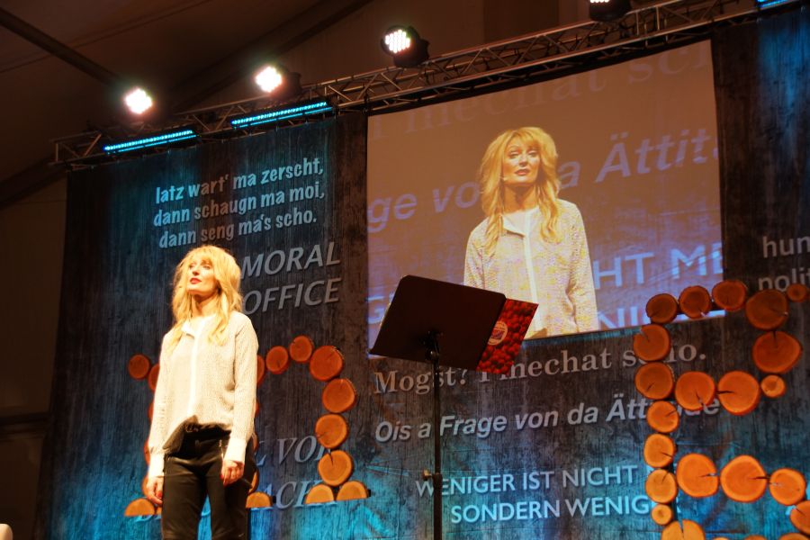 Besonders gefiel ihr ein Spruch von Albert Einstein: „Glück, dass ist im Wesentlichen ein bisschen Gesundheit und viel schlechtes Gedächtnis“. Monika Gruber hatte zu allem und zu jedem etwas zu sagen, egal ob Oberpfälzer, bei denen es so stad und die Zeit spurlos vorbeigegangen ist…… die vor 20 Jahren noch den letzten Missionar „gfressn ham“, Ossi, Holländer, Türken, Griechen und Spanier.