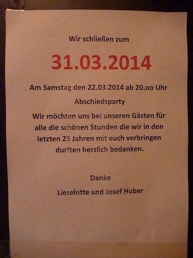 Wieder gehört ein Stück Pfaffenhofen der Vergangenheit an, Huber’s Musikkneipe, besser bekannt als „ da Schlumpf“ hat seine Tore für immer geschlossen. Ein Kneipenflohmarkt am Dultsonntag beendet eine Ära, die letzte Nacht war lang und erinnerungsträchtig, die Kneipenband gab ihr Bestes, Servus Schlumpf!