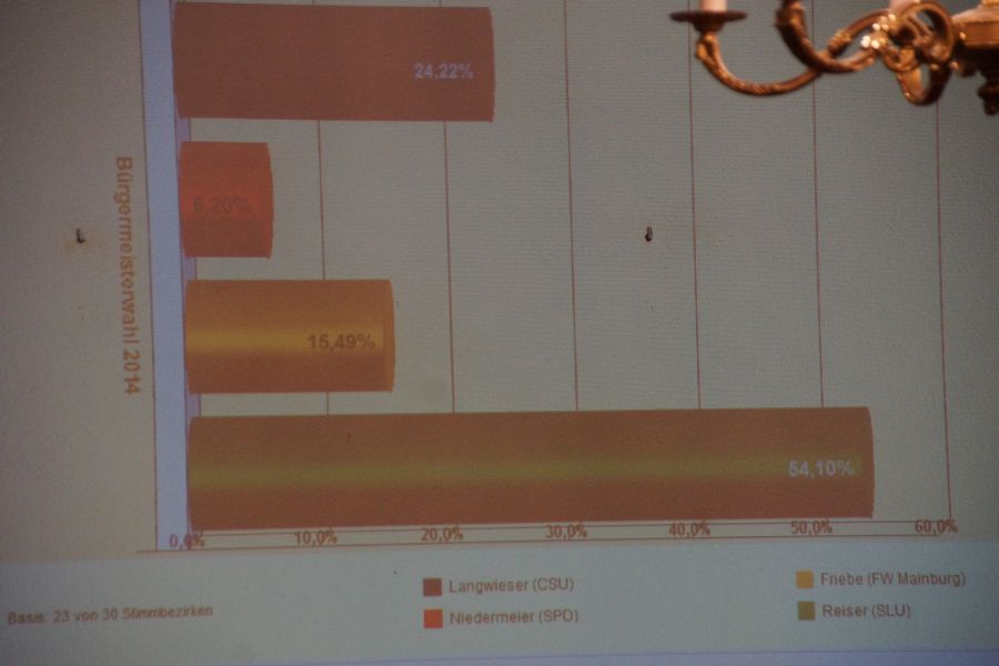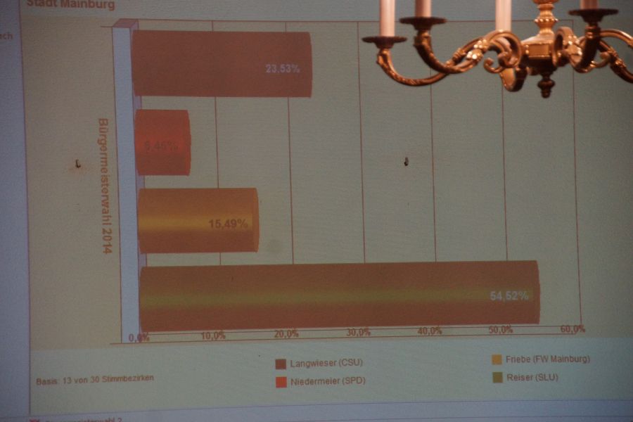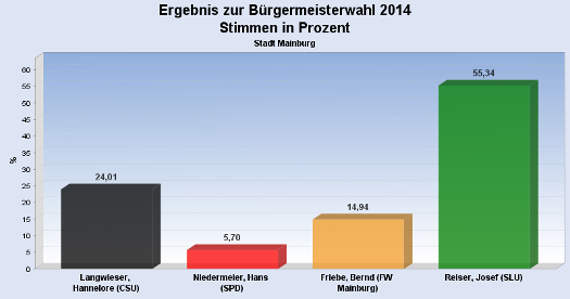 Josef Reiser erhielt 3.192 Stimmen (55,34%), Hannelore Langwieser 1.385 Stimmen (24,01%), Bernd Friebe 862 Stimmen (14,94%) und Schlußlicht ist Hans Niedermeier, er erhielt grade mal 329 Stimmen, das sind 5,7%.