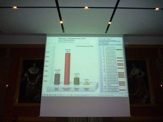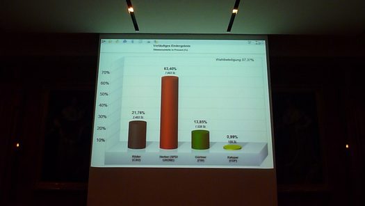 Thomas Herker 63,43 Prozent, Thomas Röder 21,76 Prozent, Albert Gürtner 13,82 Prozent, Viktor Kalupar 0,99 Prozent. Die Wahlbeteiligung liegt bei 58,79 Prozent. Anzahl der Stimmen für Thomas Herker 7178, Thomas Röder 2463, Albert Gürtner 1564, Viktor Kalupar 112.