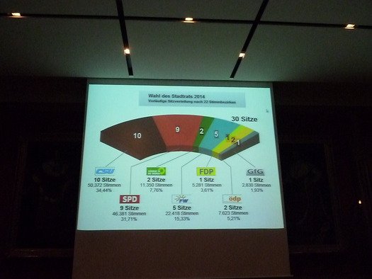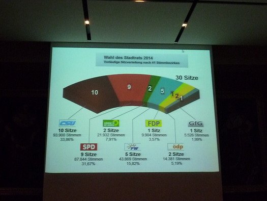 Für die klar unterlegene CSU hinter ihrem Spitzenkandidaten Thomas Röder sollte es noch schlimmer kommen. Nach erhofften 13 Mandaten sahen sich die CSU Getreuen mit letztendlich 10 Sitzen im Stadtrat nicht nur vom Wähler verlassen. Gründe mag es viele geben, der deutliche Zugewinn der SPD lässt sich jedoch nur mit der Zufriedenheit des Wahlvolkes mit der Arbeit der Bunten Koalition erklären. Ein erneuter Wechsel war nicht vorgesehen, für die ehemalig stolzen Konservativen bedeuten 34,09% schon fast Diaspora.