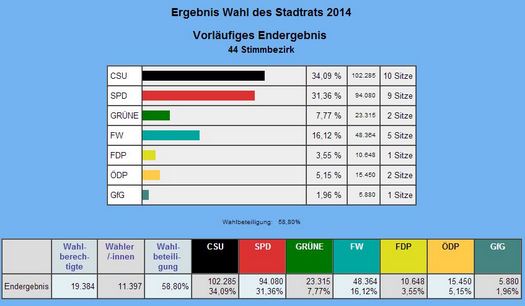 Nach 44 ausgezählten Stimmbezirken kommt es zu folgender vorläufiger Sitzverteilung: CSU zehn Sitze 34,09%, SPD neun 31,36 % , Grüne zwei 7,77 % , FW fünf 16,12 % , FDP ein Sitz 3,55 %, ÖDP zwei Sitze 5,15, und GfG ein Sitz 1,96 % . Die CSU verliert einen Sitz und die SPD gewinnt drei Mandate hinzu. Die Grünen verlieren einen Sitz, ebenso wie die FDP. Die FW und ÖDP haben ihre Sitze behauptet – die neue GfG ("Gemeinsam für Gemeinwohl") hat auf Anhieb den Einzug in den Stadtrat geschafft.