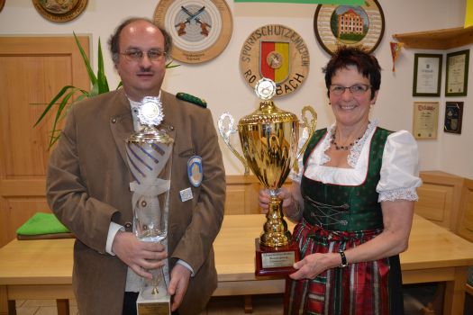 Schützenmeisterin Sigrid Kersten und Kassier Gerhard Herrmann mit den Sieger-Pokalen