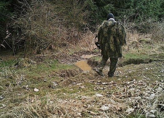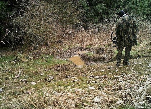 Die Fotos zeigen den mit Tarnkleidung ausgerüsteten Vermummten an einer so genannten Suhle, eine meist schlammige Bodenvertiefung, die gerne von Wildschweinen aufgesucht wird. In der Hand hält er eine offenbar geladene und gespannte Armbrust. Aus Ermittlungsgründen wurde der Vorfall vom 27. Februar erst jetzt bekannt gegeben.