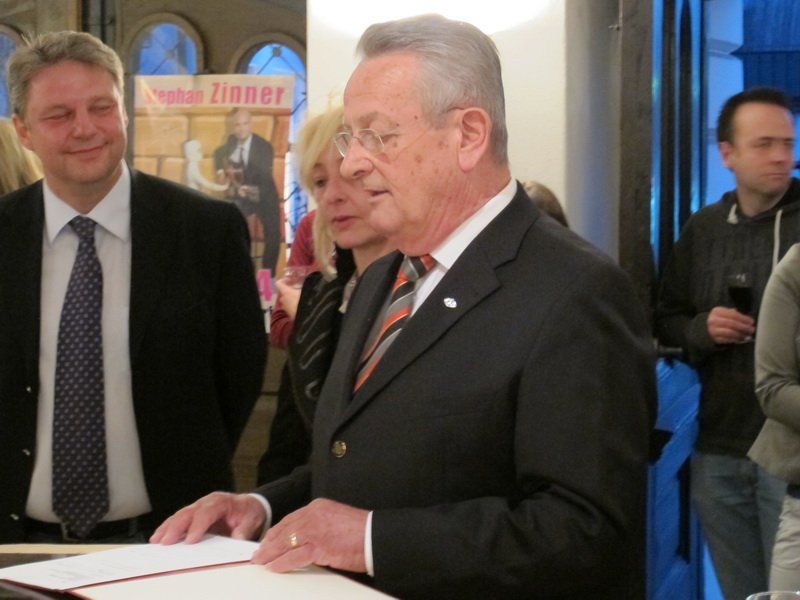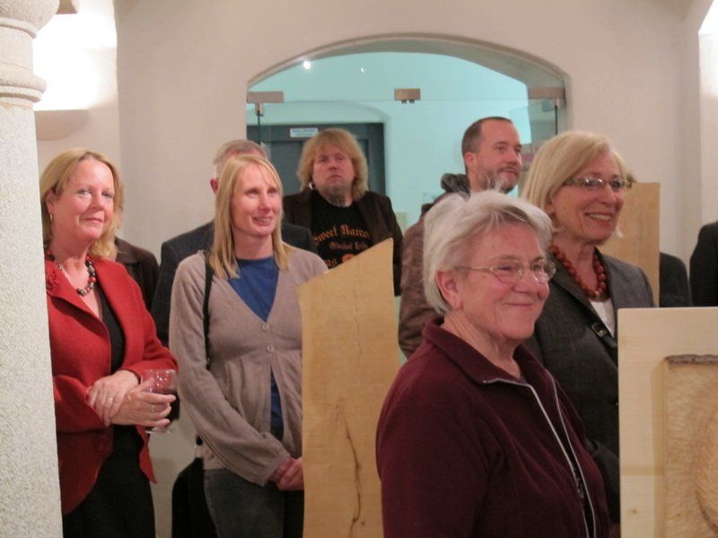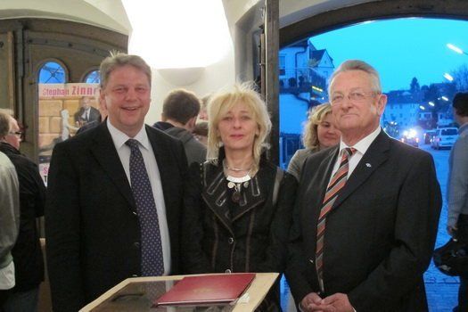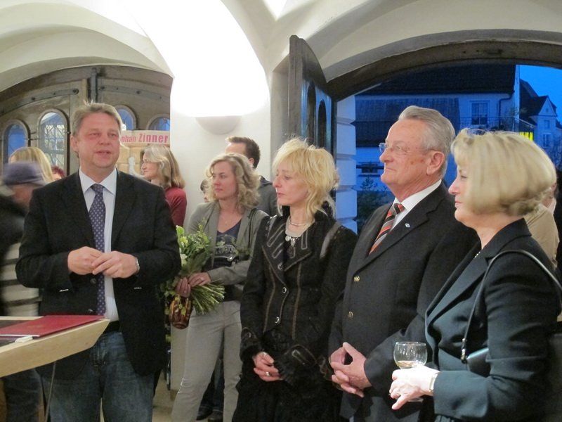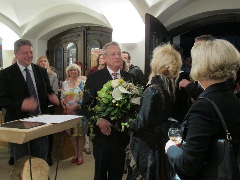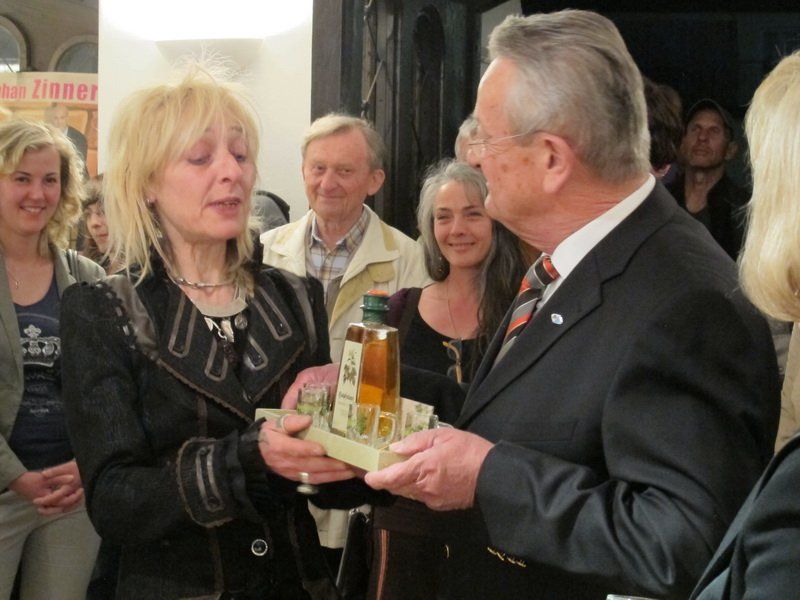 Um das große Verdienst Siegmunds für 24 Jahre Wolnzacher Kultur zu würdigen, kamen Jens Machold und Gattin und der 1. Bürgermeister hielt eine eigene Rede vor Siegmund über Ponsot und Siegmund. Im Anchluss versprach Siegmund, auch nach seiner Amtszeit für die Kultur Wolnzachs präsent zu sein, gerade im Jubiläumsjahr. Die Marktgemeinde wird auch weiter Nathalie Ponsot unterstützen mit Raum, Buffet und Werbung. Die Vernissagen seien ein Stück Marktkultur geworden.