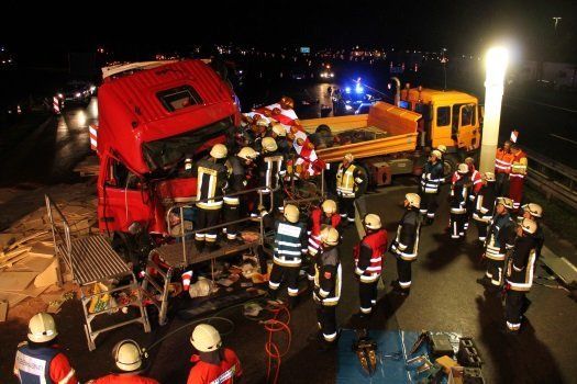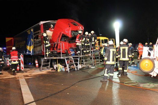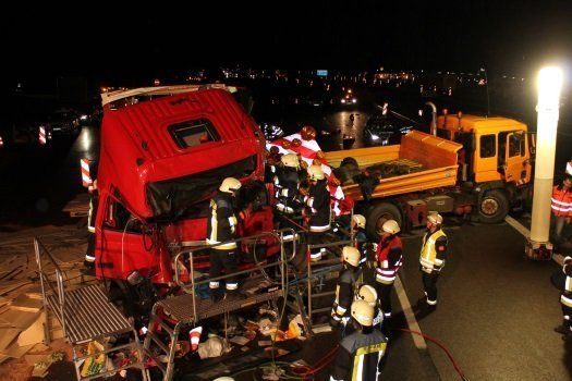Der Fahrer des Absicherungsfahrzeuges wurde dabei schwer verletzt. Der Fahrer des Sattelzuges wurde in seinem Führerhaus eingeklemmt und verstarb an der Unfallstelle. Die Bergungsarbeiten auf der voll gesperrten Autobahn zogen sich mehrere Stunden hin.