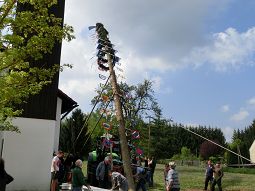 Mit der vereinten Kraft von Traktor und Menschenkraft gelang es, den Baum in die Erde neben den Dorfplatz zu platzieren. Dies ist das 2. Jahr, dass er an diesem neuen Standplatz steht, früher war sein Platz im Wirtsgarten auf der anderen Strassenseite. Als aber der Dorfplatz erneuert wurde und der Wirt schloss, fand man für ihn einnen neuen Platz. Begleitet wurde das Aufstellen von einer Maifeier für die Bevölkerung, auf dem Platz waren Biertische und - bänke aufgebaut und es gab Kaffee und Kuchen, später auch noch Grillfleisch und Deftiges.