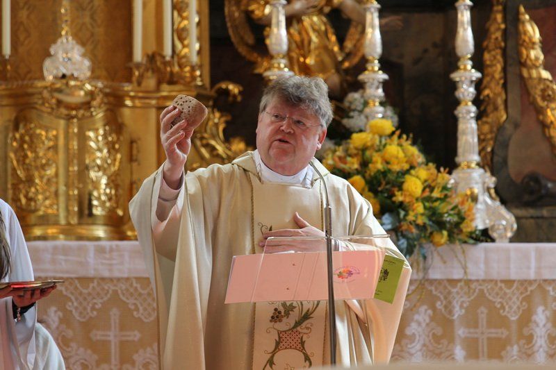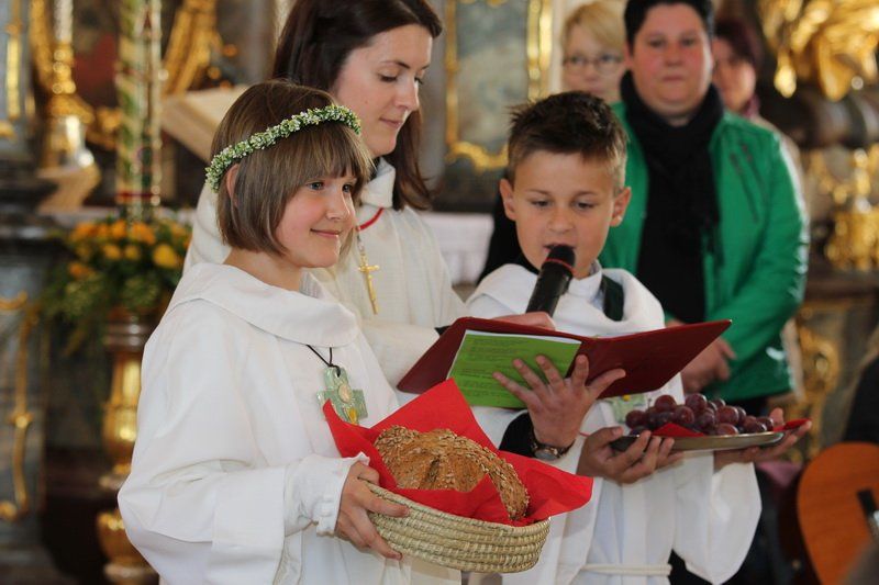 Seit Schuljahresanfang haben sich die 36 Mädchen und Jungen auf diesen Tag vorbereitet. „Ihr habt gemeinsam Brot gebacken und euer Herz auf Jesus vorbereitet“, so der Gemeindepfarrer, der sich in diesem Zuge auch bei allen bedankte, die diesen Gottesdienst halfen, mit vorzubereiten. „Ihr hab euch als Motto Brot und Wein gewählt“, so Braun. Brot hat dabei nicht nur die Bedeutung, satt zu machen, sondern auch den Hunger nach Gott zu stillen, dies stellte der Seelsorger eindrucksvoll anhand einer kleinen Geschichte dar. „Ein kleiner Laib Brot kann viele Menschen satt machen.“