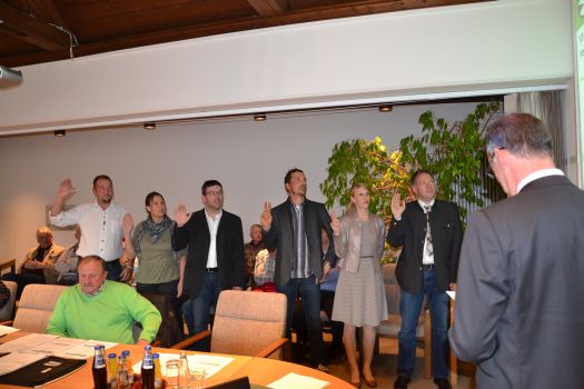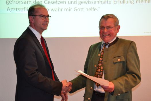 Doch bevor Peter Keck voll in die Tagesordnung einsteigen konnte, wurde er auf das Grundgesetz und die Bayerische Verfassung vereidigt. Als „Alterspräsident“ nahm ihm Gemeinderat Michael Schweiger den Eid ab. Erst dann konnte der Bürgermeister selbst die neuen 6 Gemeinderats -Mitglieder vereidigen.