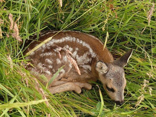 Rehkitze liegen oft regungslos und durch ihre Fellzeichnung gut getarnt auf einer Wiese, damit sie von ihren Fressfeinden nicht wahrgenommen werden. Die Rehgeiß lässt ihren Nachwuchs durchaus auch mal länger allein. Nicht, weil sie etwa eine "Rabenmutter" wäre, sondern um ihn gerade durch ihre Abwesenheit zu schützen. Das Muttertier ist meist in unmittelbarer Nähe und passt aus der Ferne auf, dass ihrem Nachwuchs nichts passiert.
