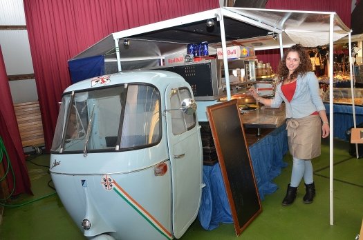 Vieles dreht sich bei der Motofair in diesem Jahr um den kultigen Motorroller Vespa. SO gab es am heutigen Nachmittag ein Vespa-Treffen vor dem Ausstellungsgelände mit anschließender Rundfahrt durch die Marktgemeinde. Neu ist ein Vespa-Museum mit teils jahrzehntealten Rollern und ein Ape-Cafe, unter anderem mit Pizzaofen, das auf einem Piaggio Ape basiert und damit aus selbigem Haus wie die Vespa stammt. Eine waschechte Sizilianerin bedient die Gäste dort unter anderem mit köstlichem Espresso. Nach dem kulinarischen Abstecher können insgesamt 26 Zweirad-Marken unter die Lupe genommen werden. Hinzu kommen Tuner und Anbieter von Accessoires.